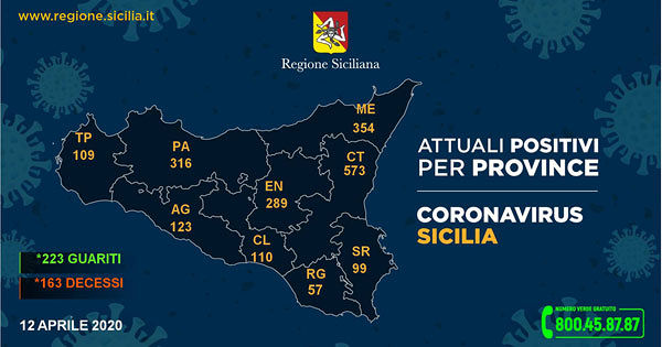 Questa la divisione degli attuali positivi nelle varie province: Agrigento, 123; Caltanissetta, 110; Catania, 573; Enna, 289; Messina, 354; Palermo, 316; Ragusa, 57; Siracusa, 99; Trapani, 109.