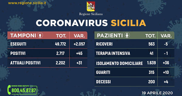Questo il quadro riepilogativo della situazione in Sicilia, aggiornato alle ore 18 di oggi (domenica 19 aprile), in merito all’emergenza Coronavirus, così come comunicato dalla Regione Siciliana all’Unità di crisi nazionale.