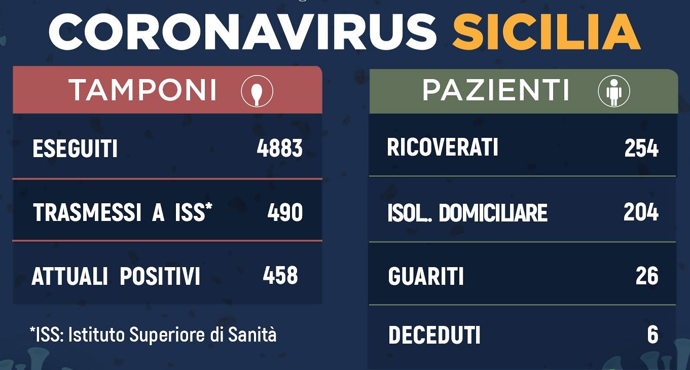 I casi di Coronavirus in Sicilia, dall’inizio dell’emergenza, e aggiornati a sabato 21 marzo sono 458 (79 più di ieri). I ricoverati 254, in isolamento domiciliare 204, guariti 26, deceduti 6. In provincia di Agrigento l’ultimo dato è di 35 contagiati dal Covid-19.