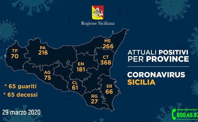 Impennata di casi di Coronavirus riscontrati nelle varie province della Sicilia, soprattutto nell’Agrigentino e Catanese, aggiornati alle 17 di oggi domenica 29 marzo, così come segnalati dalla Regione Siciliana all’Unità di crisi nazionale. La provincia di Agrigento sarebbe passata da 62 a 75 casi di Covid-19.