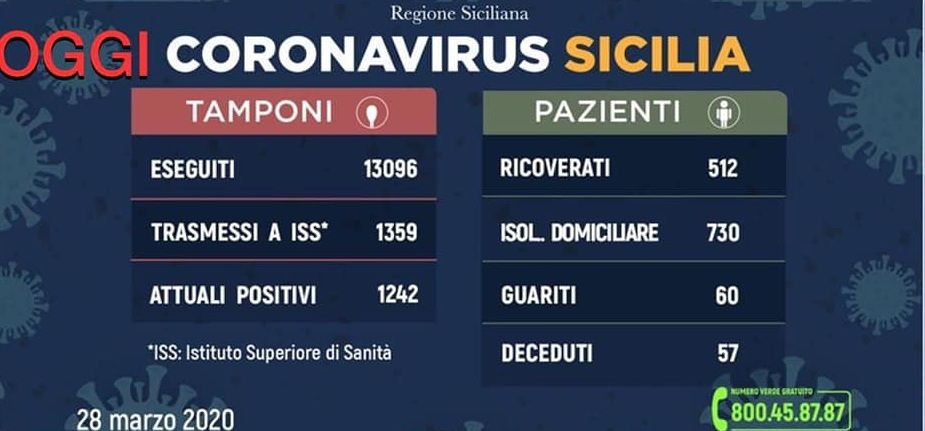 Aumentano i morti per Coronavirus in Sicilia. Sono 18 in più rispetto alle precedenti 24 ore. I dati aggiornati alle ore 12 di sabato 28 marzo. Dall’inizio dell’emergenza Coronavirus in Sicilia sono stati eseguiti 13.096 tamponi, di questi sono risultati positivi 1359 (99 più di ieri).