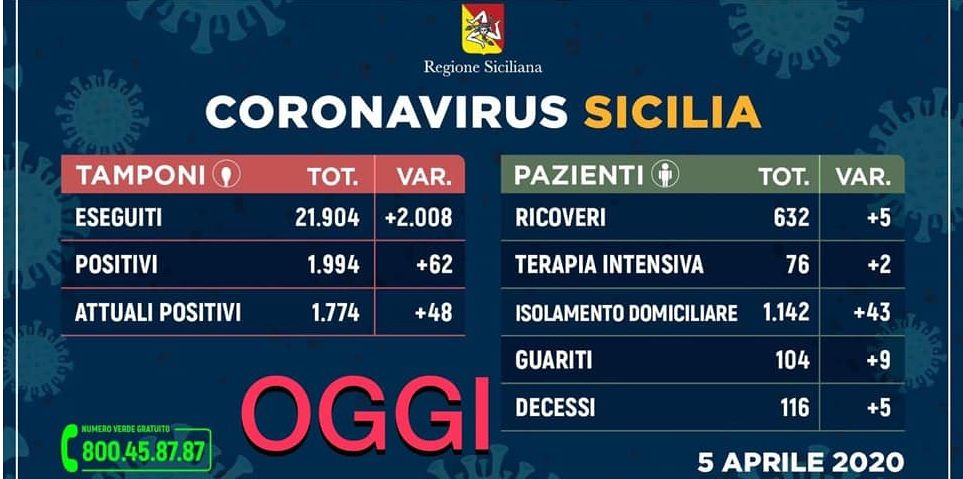 Questo il quadro riepilogativo della situazione nell’Isola, aggiornato alle ore 17 di oggi (domenica 5 aprile), in merito all’emergenza Coronavirus, così come comunicato dalla Regione Siciliana all’Unità di crisi nazionale.