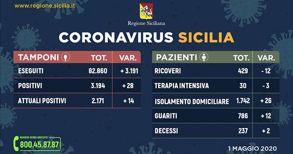 Questo il quadro riepilogativo della situazione in Sicilia, aggiornato alle ore 15 di oggi (venerdì 1 maggio), in merito all’emergenza Coronavirus. La divisione degli attuali positivi nelle varie province siciliane: Agrigento, 69; Caltanissetta, 124; Catania, 671; Enna, 289; Messina, 377; Palermo, 382; Ragusa, 57; Siracusa, 110; Trapani, 92.