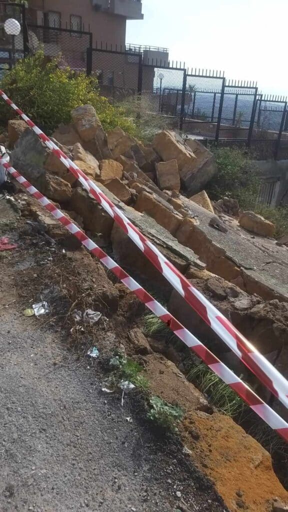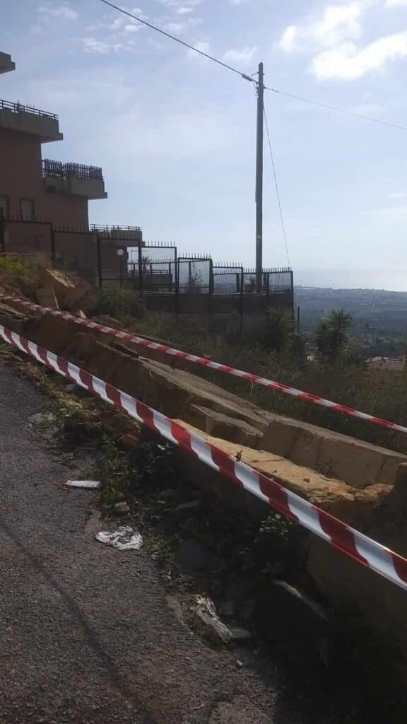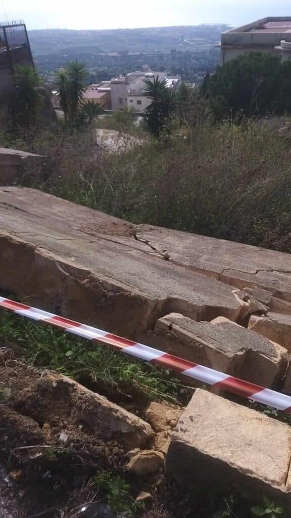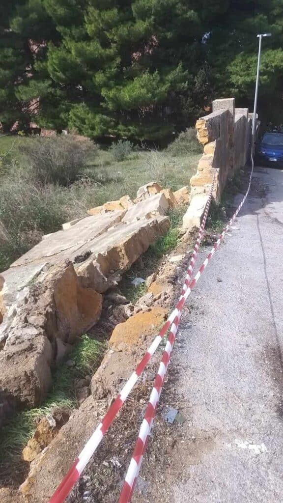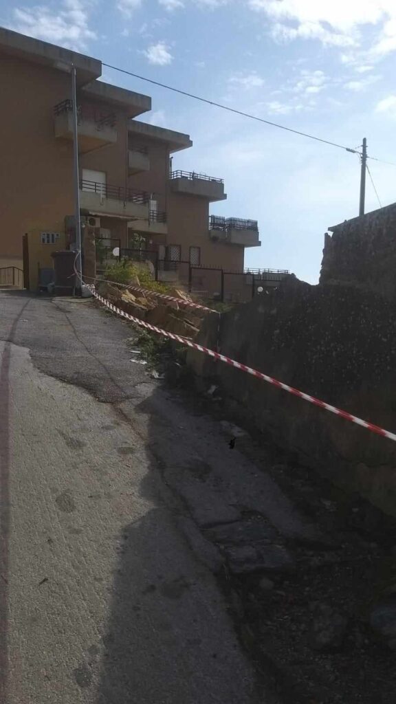Durante la notte è collassata un’ampia porzione del muro, in conci di tufo, di fronte il serbatoio della Rupe Atenea e parte della recinzione e del sistema di contenimento dell’ex ospedale San Giovanni di Dio in via Diodoro Siculo, oggi di proprietà della Regione siciliana. La parte rimasta in piedi in mancanza di interventi urgenti è vicina al crollo. Il muro è considerato di rilevanza storica.