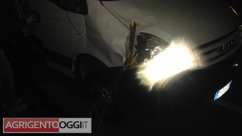 Secondo una prima ricostruzione l’autovettura ha colpito in pieno il grosso tronco ed il conducente, un carabiniere che si stava recando al lavoro, è rimasto lievemente ferito. Nessuna conseguenza per il conducente del furgone, anche se il mezzo ha riportato danni (FOTO). Sul posto i vigili del fuoco del distaccamento di  Sciacca che hanno dovuto rimettere in sicurezza la strada, che è rimasta chiusa per circa un’ora.