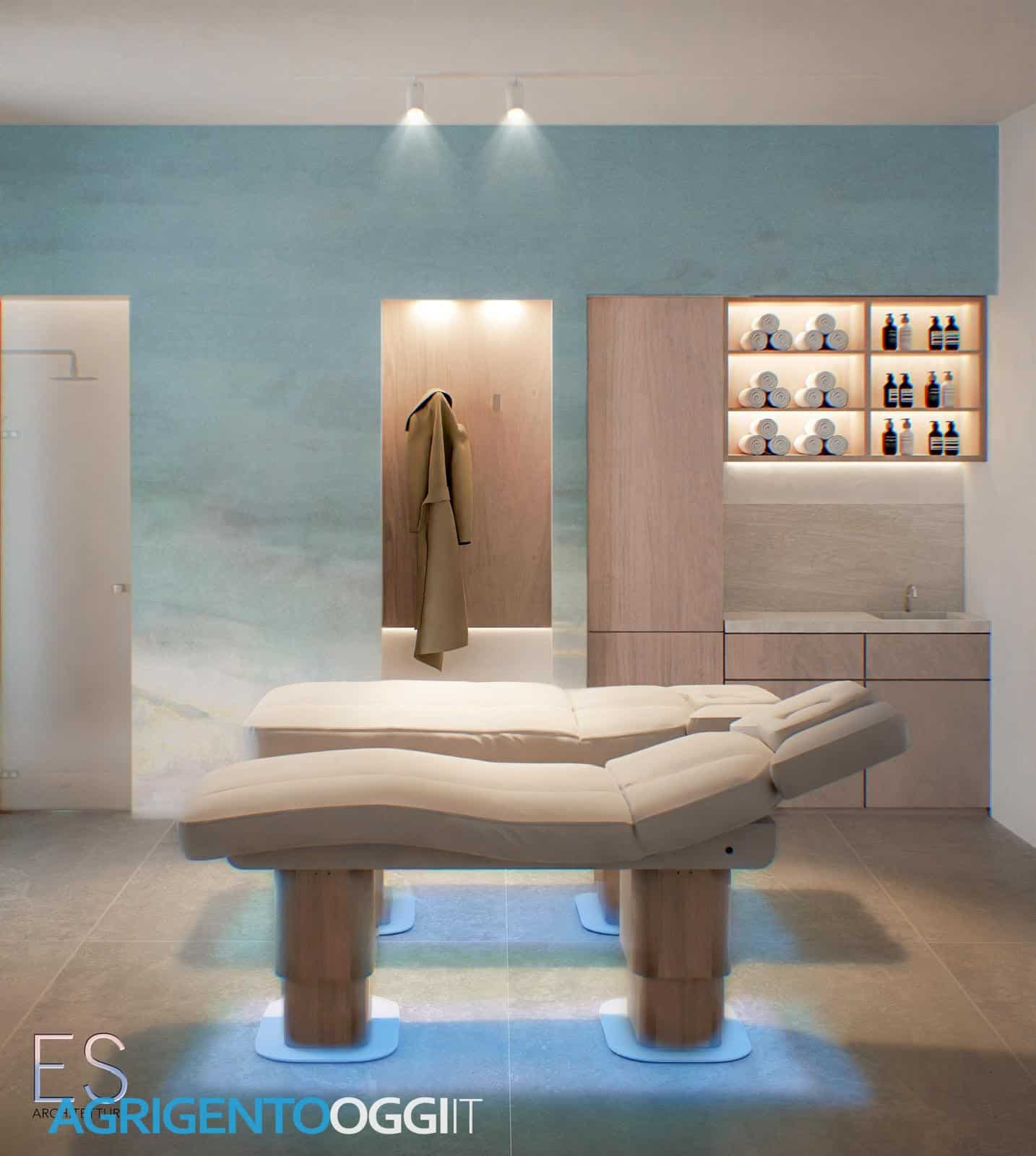 Le immagini raccontano concretamente la visione progettuale di ES Architettura. Dalle Aquasuite – vere e proprie suite wellness con vasca immersione privata integrata nella camera – dove l’acqua diventa elemento centrale dell’esperienza abitativa, fino agli ambienti SPA in fase di progettazione che combinano materiali naturali, illuminazione studiata e percorsi funzionali dedicati al relax e al recupero fisico.