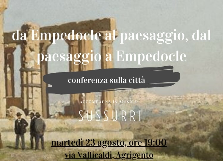 Si svolgerà martedì 23 agosto, alle ore 19:00, in via Vallicaldi, ad Agrigento, la conferenza sulla città intitolata “Da Empedocle al paesaggio, dal paesaggio a Empedocle”. Personalità differenti raccontano il loro punto di vista sulla città di Agrigento. In forma critica, in modo analitico, con passionalità. Il passato, e soprattutto il futuro, di un luogo probabilmente da reinterpretare.