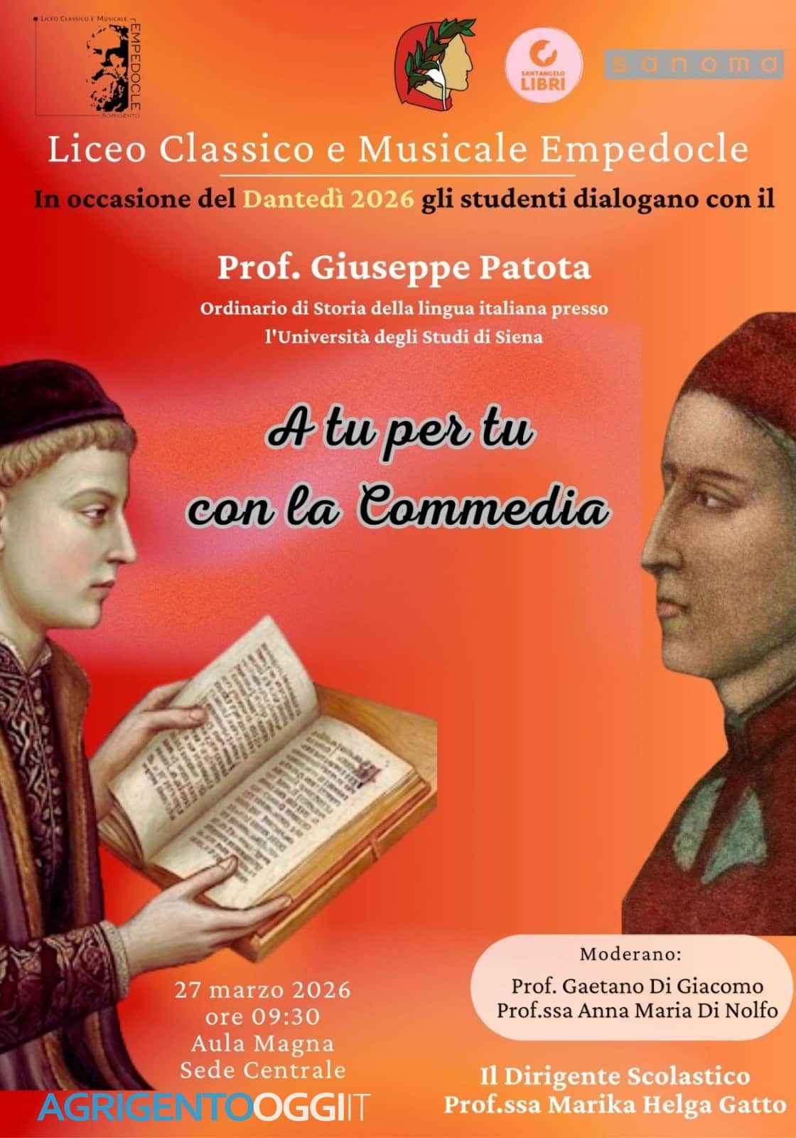 Il Liceo Classico e Musicale “Empedocle” di Agrigento celebra, il 27 marzo 2026, il “Dantedì”, giornata nazionale dedicata a Dante Alighieri, con un’importante iniziativa culturale che si inserisce nel solco di una tradizione didattica attenta alla valorizzazione del patrimonio letterario italiano.