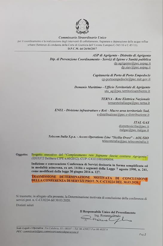 Finalmente il Commissario unico, Enrico Rolle, ha dichiarato conclusa positivamente la conferenza dei servizi, finalizzata all’approvazione del progetto esecutivo per il completamento della rete fognaria per la fascia costiera di Agrigento, ed ora potrà essere indetta la gara per la realizzazione di queste importanti opere fognarie, con un importo di 2,6 milioni di euro.
