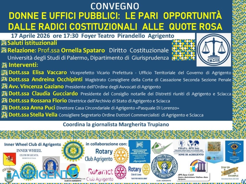 Il prossimo 17 Aprile 2026, la raffinata cornice del Foyer del Teatro Pirandello di Agrigento ospiterà un incontro di altissimo profilo intitolato: “Donne e Uffici Pubblici: le Pari Opportunità dalle Radici Costituzionali alle Quote Rosa”. L’evento, promosso dall’Inner Wheel Club di Agrigento, si propone di analizzare l’evoluzione del ruolo femminile nelle istituzioni attraverso un percorso storico, giuridico e sociale.