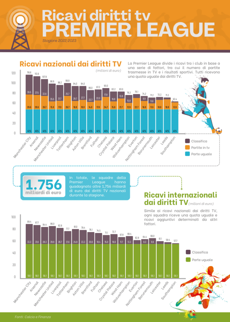 Di questi tempi un club in inglese, ad esempio nell’anno 2022-23, ricava in media solo di diritti televisivi circa 162 milioni di Euro. In Italia la media è più bassa, si parla di quasi 51 milioni e l’Inter che è la squadra che ne riceve di più ne incassa solo 87 milioni.