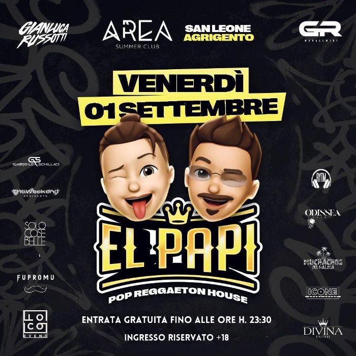 Il progetto musicale EL PAPI arriva ad Agrigento: appuntamento venerdì primo settembre nei locali dell’Area di via Cavaleri Magazzeni. EL PAPI trasporterà le sonorità e le “calde atmosfere” che solo il raggaeton è in grado di regalare , in contesti urbani unici, impensabili e irripetibili . Balli, installazioni e allestimenti a tema saranno i protagonisti, tutto il resto lo farà la musica. Ingresso libero fino alle 23:30 e solo per maggiorenni. I primi 500 avranno un ingresso omaggio per un’altra serata, sempre nella discoteca all’aperto, che è in programma sabato 2 settembre con Davide Don, già concorrente del GF Vip ed ex tronista di Uomini e Donne.