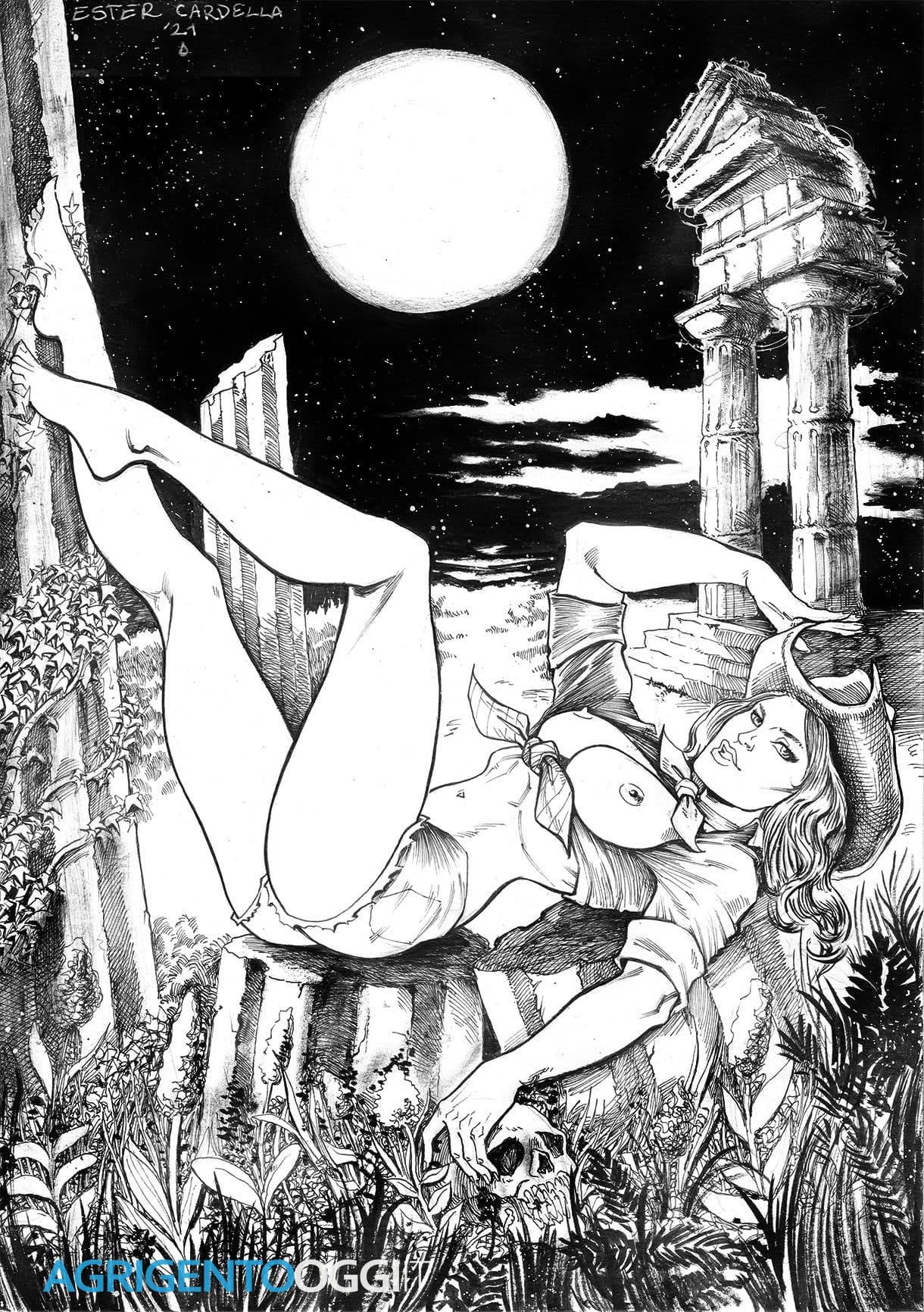Agrigento e la Valle dei Templi entrano già nel tuo immaginario. In questo disegno hai unito rovine classiche, natura e una figura femminile molto forte. Come nasce questa visione?