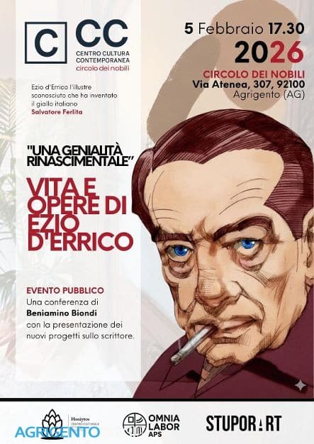 Giovedì 5 febbraio 2026, alle ore 17.30, il Circolo dei Nobili di Agrigento (Via Atenea, 307) ospiterà l’evento pubblico “Una genialità rinascimentale. Vita e opere di Ezio d’Errico”, dedicato alla riscoperta di una delle figure più originali e ancora poco conosciute della letteratura italiana del Novecento. L’incontro è promosso dal Centro Cultura Contemporanea – Circolo dei Nobili (CC) , in collaborazione con Hosàytos – Centro culturale editore & biblioteca, Omnia Labor APS e StuporArt.