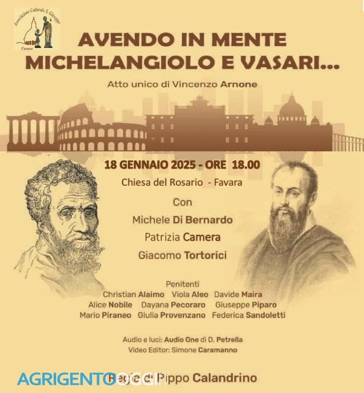 Sabato 18 gennaio alle ore 18:00, nella suggestiva cornice della Chiesa del Rosario a Favara, andrà in scena lo spettacolo teatrale “Avendo in mente Michelangiolo e Vasari…”, un atto unico scritto da Don Vincenzo Arnone e diretto dal regista Pippo Calandrino. L’evento, promosso dall’Associazione Culturale San Giuseppe di Favara, rappresenta un’importante occasione per immergersi nel mondo della cultura rinascimentale attraverso il teatro. Il testo di Don Vincenzo Arnone esplora il rapporto tra due giganti della storia dell’arte: Michelangelo Buonarroti, genio assoluto della scultura, pittura e architettura, e Giorgio Vasari, pittore, artista e storico, noto anche per essere l’autore delle Vite de’ più eccellenti pittori, scultori e architettori. Sotto la sapiente regia di Pippo Calandrino, il pubblico sarà trasportato in un viaggio affascinante, tra parole e immagini, per riscoprire la grandezza dell’arte rinascimentale e il complesso rapporto tra questi due protagonisti. La rappresentazione si inserisce nel calendario delle iniziative dell’Associazione San Giuseppe, da sempre impegnata nella valorizzazione del patrimonio artistico e culturale del territorio. L’ingresso è libero e aperto a tutti gli appassionati di teatro e arte. Un’occasione da non perdere per chi ama la bellezza e la storia.