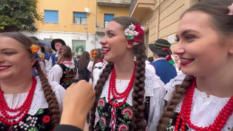 “Vorremmo vincere il Tempio d’Oro, pregate per noi”. Il gruppo polacco “KRAKUS” partecipa con l’obiettivo di portare a casa la vittoria. È stato un vero piacere incontrare e intervistare stamattina il gruppo “KRAKUS” qui a Piazza Cavour! Fondato nel 1949 presso l’Università della Scienza e della Tecnologia di Cracovia, sono il più antico ensemble folcloristico studentesco polacco. Con 30 talentuosi membri, tra cui due violinisti, un bassista e un coro, ci hanno deliziato con balli e danze tradizionali polacche. Quest’anno celebrano il loro 75° anniversario e hanno incantato pubblici internazionali negli ultimi 5 anni. In occasione della 76esima edizione della Sagra del Mandorlo in Fiore, ci hanno regalato un programma tipico della Polonia meridionale, con il celebre Krakowiak e le Danze dei Precarpazi della regione di Resovia. Un’esperienza indimenticabile.