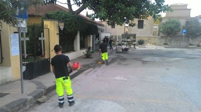 Gli operai di Iseda e Sea, continuano, ogni mattina a partire dalle 5, con il decespugliamento e il successivo spazzamento dell’area adibita a posteggio delle auto, della strada di accesso al cimitero e di tutte le zone adiacenti.