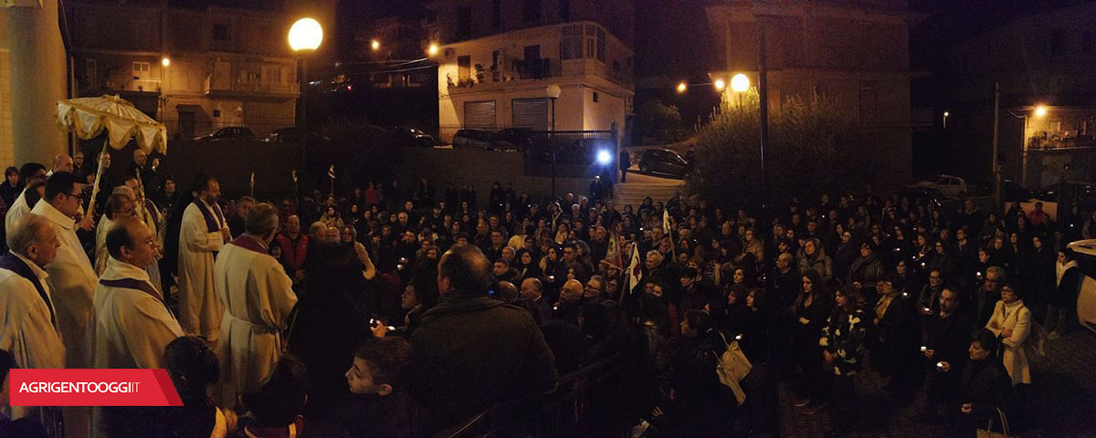 Presenti oltre alla Sindaca, diversi Assessori ed alcuni Consiglieri Comunali, tra cui il Presidente Totò Di Naro.  Circa  un migliaio i partecipanti alla fiaccolata, che dopo il giro si sono ritrovati ancora nello stesso punto di partenza, ancora davanti al sagrato della stessa Chiesa,   per ascoltare, prima della Benedizione Eucaristica,   una riflessione dell’Arciprete don Giuseppe D’Oriente. Che non poteva non parlare  dell’ultimo gravissimo fatto di sangue, avvenuto a Favara nella prima mattinata di venerdì u.s., cioè  l’omicidio del quarantenne Emanuele Ferraro.