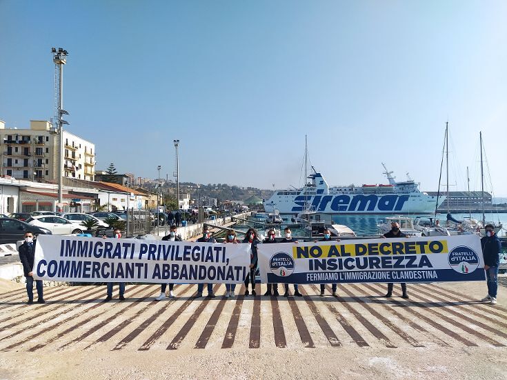 “Immigrati privilegiati, commercianti abbandonati”: recitava così lo striscione esposto questa mattina da rappresentanti di Fratelli d’Italia a Porto Empedocle, all’interno della area portuale. Il partito ha voluto ribadire il “no all’immigrazione clandestina” con un Flash mob. I rappresentanti locali del partito, muniti di striscioni e bandiere tricolori, hanno voluto manifestare contro gli sbarchi di migranti sulle coste agrigentine. “Negli ultimi due giorni sono approdati sulle nostre coste- dice il commissario provinciale di Fratelli d’Italia, Calogero Pisano- centinaia e centinaia di immigrati pure con il covid. È una situazione che non si può più sostenere, chiediamo al governo nazionale di bloccare questi sbarchi. Siamo solo all’inizio dell’anno, immaginate cosa succederà quando il mare sarà calmo in piena estate. Manifestiamo contro l”immigrazione clandestina e a favore dei porti chiusi”.