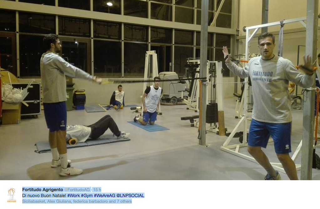 Già archiviata la strepitosa vittoria del PalaConad, La Fortitudo Moncada Agrigento torna a faticare perfino il giorno di Natale. Ieri pomeriggio 25 dicembre, De Laurentis e compagni hanno smaltito in palestra panettoni e cannoli siciliani. Il 29 al PalaMoncada arriva la Givova Scafati, per l’ultima dell’anno. Agrigento insegue la quinta vittoria di fila. Adesso la squadra di Ciani vuole continuità. Dopo la vittoria nel derby il morale è alle stelle e la squadra ha preso consapevolezza sui propri mezzi. Sul profilo Twitter della Fortitudo la foto degli allenamenti di Natale. (DV)