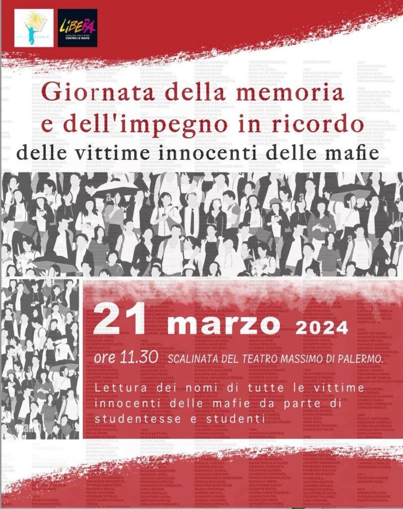 In occasione della XXIX Giornata della memoria e dell’impegno in ricordo delle vittime innocenti delle mafie che si celebrerà giovedì 21 marzo 2024, la Rete per la Promozione della Cultura Antimafia nella Scuola, in collaborazione con l’associazione Libera, organizza un evento che coinvolgerà migliaia di studentesse e studenti, docenti e dirigenti provenienti da tutta l’isola. Tra questi anche gli studenti del Liceo “Leonardo” di Agrigento diretto da Patrizia Pilato. Sulla scalinata del teatro Massimo di Palermo, a partire dalle ore 11,30 e fino alle 12,45, si svolgerà un momento di riflessione condivisa: alunne e alunni leggeranno i nomi di tutte le 1.081 vittime innocenti delle mafie, tra le quali 134 donne e 115 bambini.