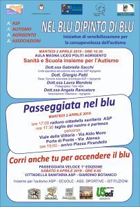 Ente istituzionale da un lato e variegato mondo dell’associazionismo dall’atro, daranno vita insieme alla rassegna “Nel blu dipinto di blu”, una nutrita, anche in questo caso, serie di iniziative di sensibilizzazione che richiama simbolicamente nel titolo la tinta “enigmatica” che, come spiegano i promotori internazionali della giornata sull’autismo, risveglia il desiderio di conoscenza e sicurezza. Martedì 2 aprile alle 10.30 presso l’aula magna del liceo “Politi” di Agrigento, Gabriella Sacchi, dirigente UOES aziendale, Giorgio Patti, responsabile del Servizio di sociologia ASP, pedagogista “ABA”, e Angela Rancatore, insegnante e referente dell’associazione “Vitautismo”, relazioneranno in materia di strategie condivise fra sanità e scuola per fronteggiare l’autismo. Anche all’interno dell’iniziativa “Nel blu dipinto di blu” sono previste due passeggiate della salute. La prima, domani pomeriggio, partirà dalla cittadella della salute per raggiungere piazza Pirandello, la seconda, sabato 6 aprile alle ore 9, si incentrerà nella zona dell’orto botanico di Agrigento.