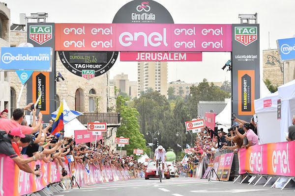 Gerusalemme, 4 maggio 2018 – Il corridore olandese Tom Dumoulin (Team Sunweb), vincitore dell’edizione precedente della corsa e Campione del Mondo di specialità, ha vinto la tappa inaugurale del centunesimo Giro d’Italia, la Cronometro Individuale di Gerusalemme di 9,7 km. Al secondo e terzo posto si sono classificati rispettivamente Rohan Dennis (BMC Racing Team) e Victor Campenaerts (Lotto Soudal).