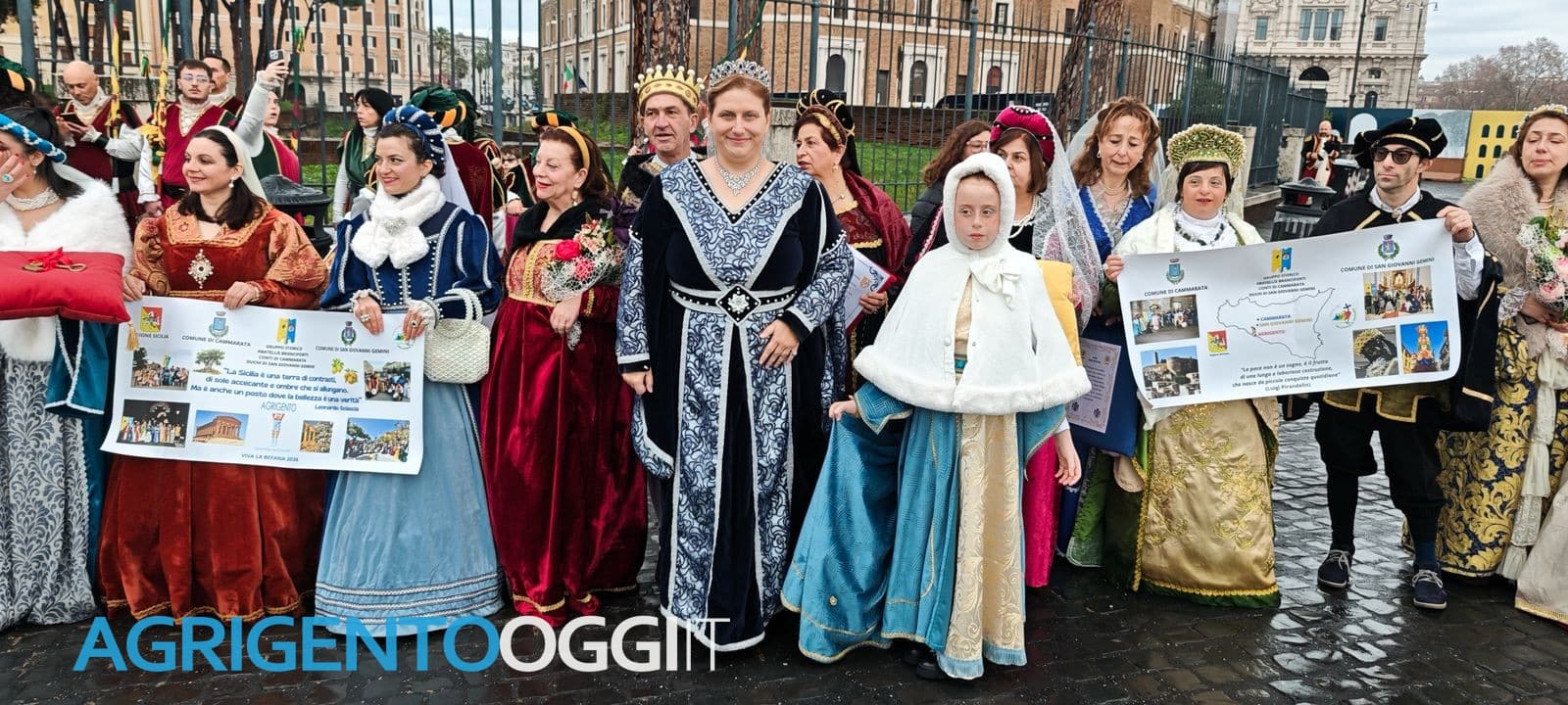 Il Gruppo Storico Abatellis Branciforti Conti di Cammarata Duchi di San Giovanni Gemini ha sfilato a Roma da Castel Sant’Angelo, lungo via della Conciliazione, fino a Piazza San Pietro in occasione del Corteo Viva la Befana 2026 che ha visto come protagonista la Sicilia. La gioia per la partecipazione ha un evento di livello nazionale svoltosi in occasione della chiusura della Porta Santa è stato straordinario per questo gli Abatellis Branciforti, gruppo inclusivo ed ecosostenibile, fondato nel 2018 dalla Presidente Professoressa Irene Catarella che continua a esserne la rappresentante legale. Appena arrivati a Roma con il pullman della linea BusAway, dopo ore di viaggio, il Gruppo, rappresentativo dei nobili di Cammarata e San Giovanni Gemini, ha incontrato al Palazzo del Vicariato in udienza privata il Cardinale Vicario Generale S.E.R. Baldo Reina, originario proprio di San Giovanni Gemini e amico storico della Presidente Catarella. “Un momento di grande commozione e di grande spiritualità in cui abbiamo condiviso la gioia dei ricordi del paese e la ricchezza di una preghiera comunitaria che si è conclusa con una benedizione da parte di Monsignor Reina su tutto il nostro Gruppo Storico Abatellis Branciforti di cui ha sottolineato l’importanza di testimoniare la nostra storia”, ha ribadito con emozione la Presidente Irene Catarella. Quattro giorni intensi che hanno visto gli Abatellis Branciforti rappresentare con orgoglio per il Corteo della Befana in abiti storici gli antenati che dal 1431 al 1680 hanno governato questa parte del territorio agrigentino, esattamente Cammarata, che hanno reso potente Contea, e San Giovanni Gemini che hanno fondato e reso ducato. Il Gruppo ha, quindi, rappresentato anche la provincia di Agrigento e la Sicilia. Un’altra benedizione ha investito il gruppo: il saluto personale di Papa Leone XIV che, durante l’udienza generale ha stretto la mano personalmente e benedetto Irene Catarella e i membri del gruppo. “La nostra felicità si è così coronata, non solo sfilando, ma incontrando il nostro caro Vicario Generale Baldo Reina e il nostro caro Papa Leone XIV e attraversando la Porta Santa”, ha sottolineato Irene Catarella, “Tutto questo è stato prezioso per ognuno di noi, ma soprattutto per le punte di diamante del nostro gruppo storico, cioè i bambini, presente il piccolo Salvatore, e le bambine, presenti Aurora, Giulia, Giorgia, Elena ed Emma, e i meravigliosi ragazzi dell’Arca onlus, di cui presenti erano Roberta e Rosolino. Sono loro che danno il valore aggiunto al nostro essere Abatellis Branciforti e a fare storia. Ringraziamo di vero cuore il Sindaco di San Giovanni Gemini Custode (Dino) Zimbardo che è venuto a Roma per sfilare con noi in modo ufficiale indossando la fascia tricolore durante il Corteo verso Piazza San Pietro e che con noi è stato all’Udienza con Papa Leone XIV, e anche l’Assessore Barbasso per la sua presenza. Ringraziamo il Sindaco Zimbardo e l’Amministrazione sangiovannese anche perché ci hanno dato l’onore di portare in Corteo lo stendardo ufficiale del Comune di San Giovanni Gemini. Ringraziamo il Sindaco di Cammarata Giuseppe Mangiapane e l’Amministrazione di Cammarata, altro nostro paese che rappresentiamo, per averci concesso di sfilare con il gonfalone ufficiale del Comune di Cammarata”. Inoltre, gli Abatellis Branciforti, che hanno alloggiato presso il Centro romano per Ferie Madre Speranza di Via Casilina, dove sono stati accolti in modo meraviglioso da Madre Lucia e dalle sue Consorelle, hanno girato la città eterna, visitando, tra l’altro, il Colosseo e Piazza di Spagna, godendo così anche delle bellezze architettoniche urbane. Tra le fila degli Abatellis Branciforti anche la Dottoressa Piera Maria Carbone, profonda specialista dei Branciforti.