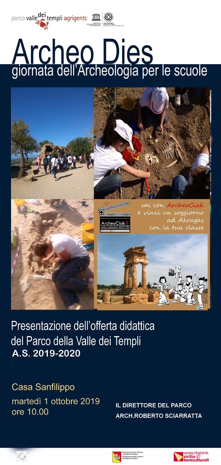 Oggi, 1 ottobre 2019, alle ore 10:00, a Casa Sanfilippo, sede del Parco Archeologico della Valle dei Templi, nell’ambito dell’iniziativa “Archeo Dies- Giornata dell’Archeologia per le scuole”, il Direttore Roberto Sciarratta presenterà ai dirigenti scolastici, ai docenti, alle studentesse e agli studenti di ogni ordine e grado la nuova offerta formativa 2019- 2020.