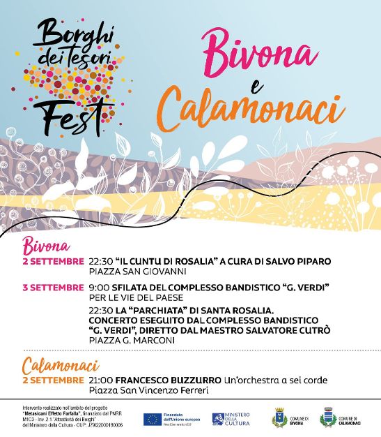 Sempre domani, ma alle 21 in piazza San Vincenzo Ferreri a Calamonaci, l’agrigentino Francesco Buzzurro – una vera orchestra in sei corde – darà vita a un concerto straordinario, tra classici, improvvisazioni e brani inediti, per una serata sospesa tra virtuosismo e suggestione. Il programma di Borghi dei Tesori è stato realizzato nell’ambito progetto “Metasicani Effetto Farfalla”, finanziato dal PNRR M1C3 inv.2.1, Attrattività dei Borghi del Ministero della Cultura. Le manifestazioni sono tutte a ingresso libero.