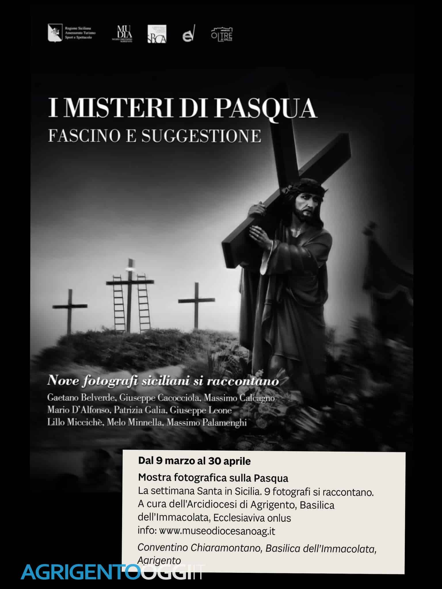 Una mostra, organizzata dal Mudia Museo Diocesano Agrigento in collaborazione con la Basilica dell’Immacolata, propone un viaggio attraverso le emozioni della Settimana Santa siciliana. L’esposizione raccoglie una selezione di immagini scattate in diversi anni da nove fotografi siciliani, ognuno con il proprio sguardo unico sulle tradizioni pasquali della propria provincia.La Settimana Santa in Sicilia rappresenta un momento di profonda spiritualità e partecipazione collettiva, in cui le antiche tradizioni religiose si fondono con l’identità culturale dell’isola. Un’eredità che si esprime attraverso suggestive processioni, sacre rappresentazioni e simbolismi tramandati nei secoli. A raccontare queste atmosfere cariche di pathos e devozione è la mostra fotografica I misteri di Pasqua, un’esposizione di grande impatto emotivo e artistico, allestita presso il Conventino Chiaramontano della Basilica dell’Immacolata ad Agrigento.