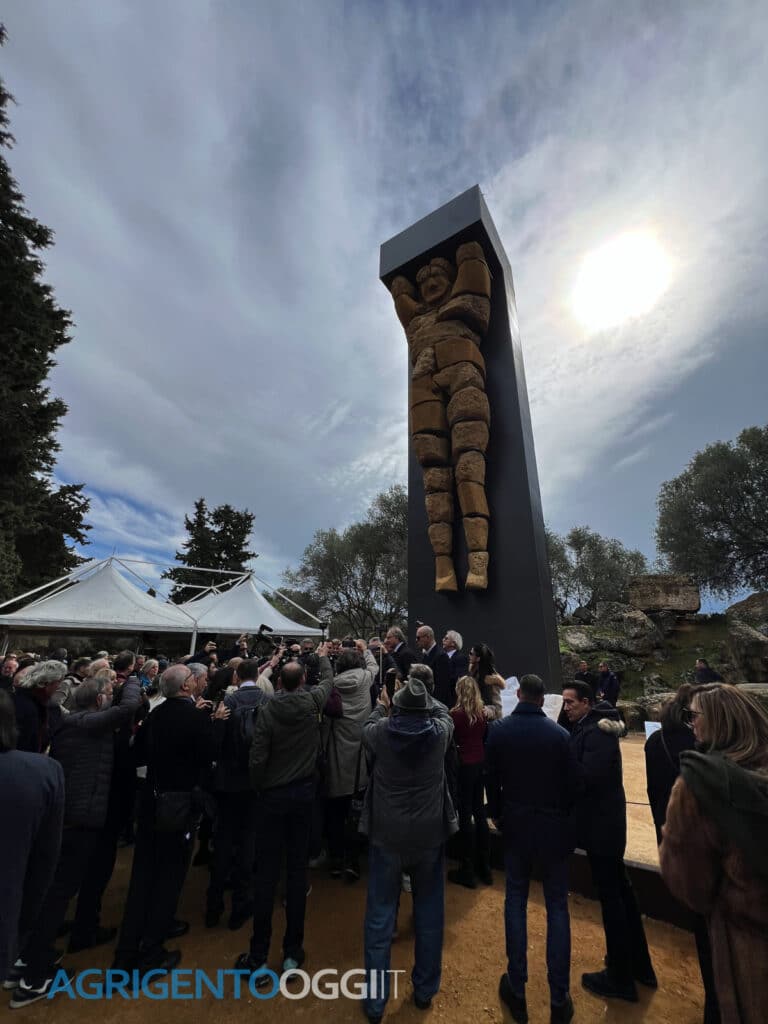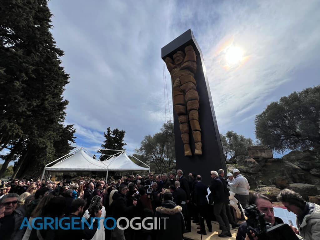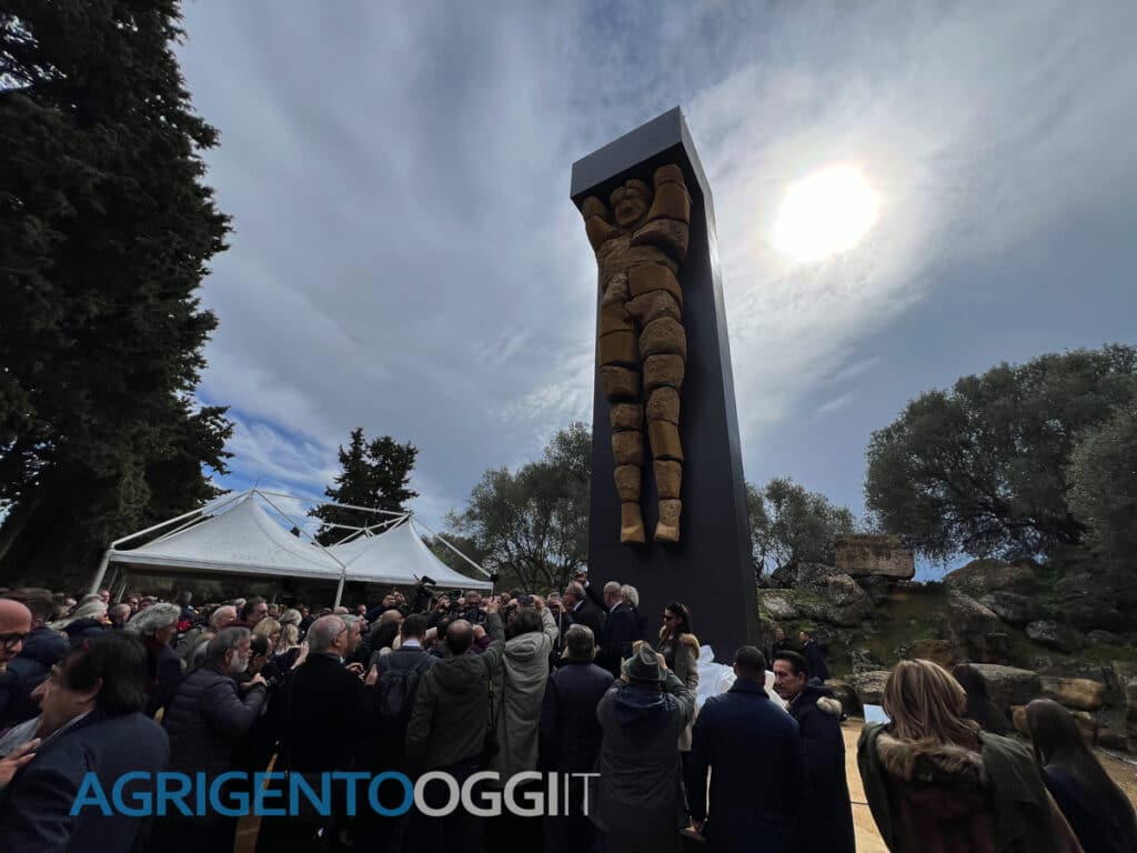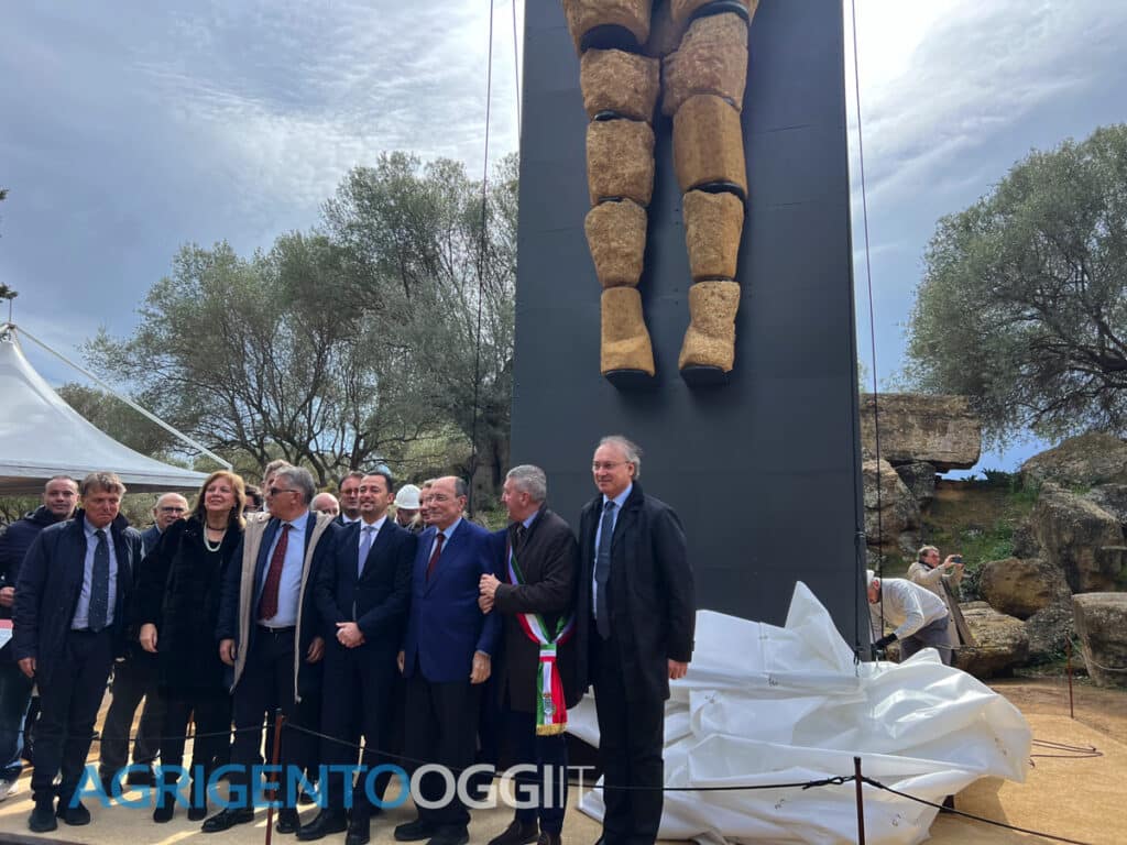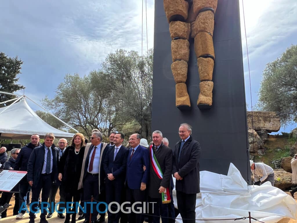 Un colosso di quasi otto metri di altezza, ai piedi di quello che fu il Tempio Di Giove Olimpico è stato “svelato” questa mattina nella Valle dei Templi di Agrigento. Alla cerimonia, tra le diverse autorità presenti, il presidente della Regione siciliana, Renato Schifani, l’assessore regionale ai Beni culturali, Francesco Paolo Scarpinato, il direttore del Parco archeologico e paesaggistico della Valle dei templi, Roberto Sciarratta; il deputato regionale Riccardo Gallo, il sindaco di Agrigento, Francesco Miccichè, il prefetto Filippo Romano e il curatore del progetto di musealizzazione, Carmelo Bennardo. Il progetto di anastilosi che ha visto la ricostruzione di uno dei Telamoni di uno dei più grandi templi dorici dell’ età classica, è stato curato dall’esperto scientifico, Alessandro Carlino. L’ imponente gigante alto 8 metri è stato ricostruito grazie ad un lungo lavoro di studio e assemblaggio di blocchi di pietra originale che giacevano all’ interno del parco. A sorreggerlo un’impalcatura in acciaio di 10 metri di altezza. Un’ opera che arricchisce ancora di più l’ area archeologica in vista dell’ anno 2025 di Agrigento Capitale della Cultura.