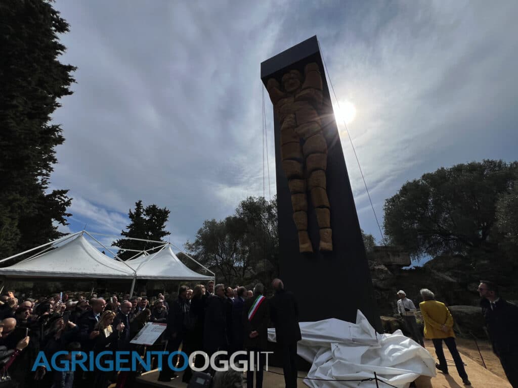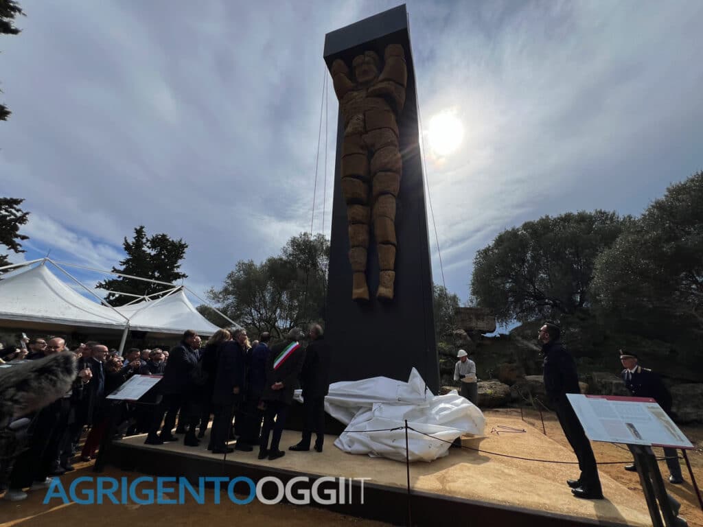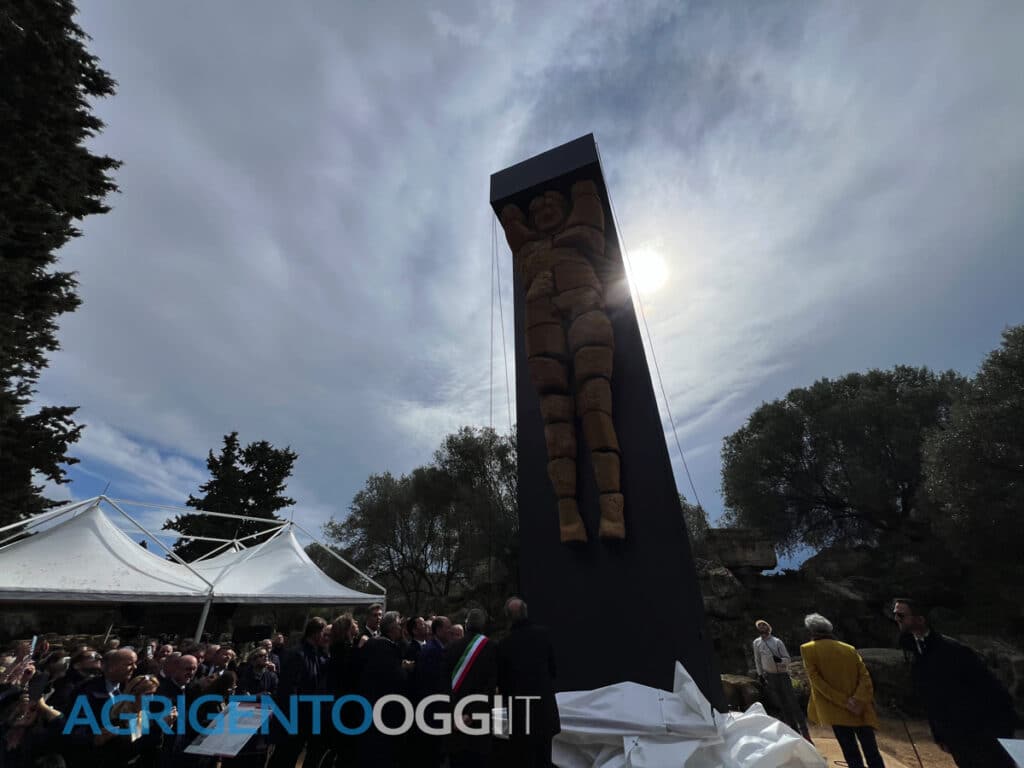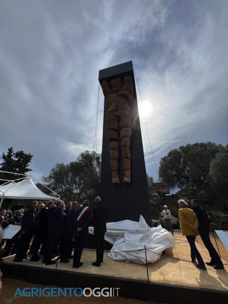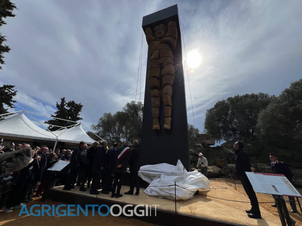 Un colosso di quasi otto metri di altezza, ai piedi di quello che fu il Tempio Di Giove Olimpico è stato “svelato” questa mattina nella Valle dei Templi di Agrigento. Alla cerimonia, tra le diverse autorità presenti, il presidente della Regione siciliana, Renato Schifani, l’assessore regionale ai Beni culturali, Francesco Paolo Scarpinato, il direttore del Parco archeologico e paesaggistico della Valle dei templi, Roberto Sciarratta; il deputato regionale Riccardo Gallo, il sindaco di Agrigento, Francesco Miccichè, il prefetto Filippo Romano e il curatore del progetto di musealizzazione, Carmelo Bennardo. Il progetto di anastilosi che ha visto la ricostruzione di uno dei Telamoni di uno dei più grandi templi dorici dell’ età classica, è stato curato dall’esperto scientifico, Alessandro Carlino. L’ imponente gigante alto 8 metri è stato ricostruito grazie ad un lungo lavoro di studio e assemblaggio di blocchi di pietra originale che giacevano all’ interno del parco. A sorreggerlo un’impalcatura in acciaio di 10 metri di altezza. Un’ opera che arricchisce ancora di più l’ area archeologica in vista dell’ anno 2025 di Agrigento Capitale della Cultura.
