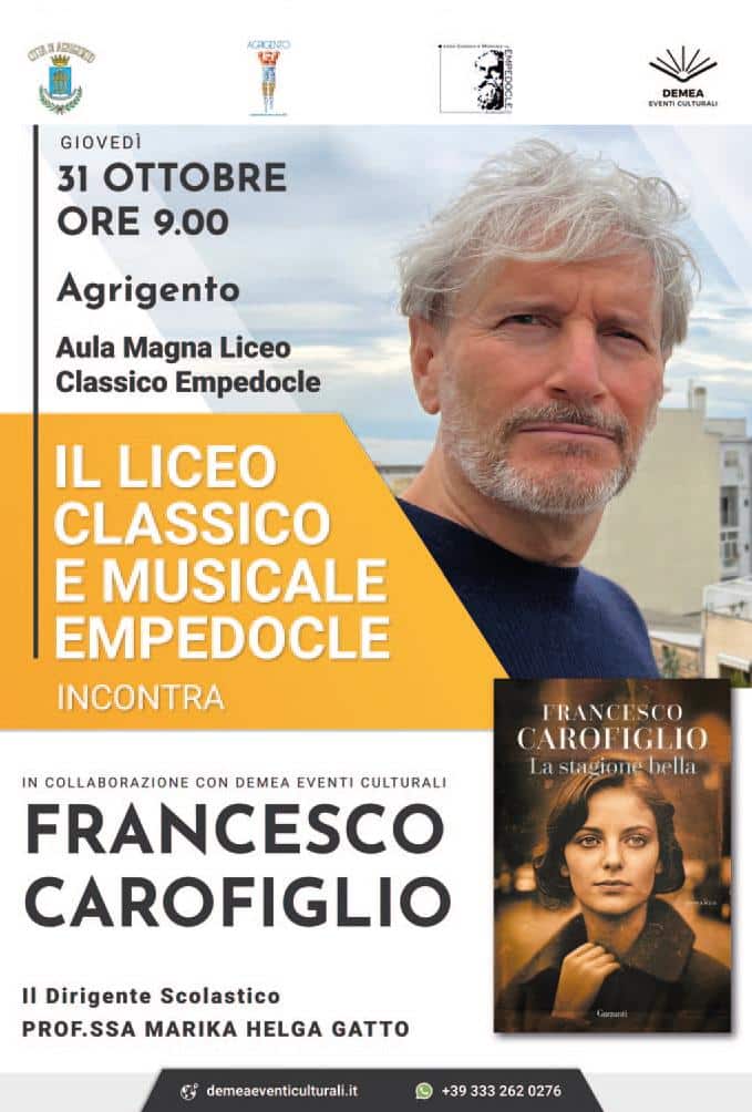 Agrigento – Un appuntamento speciale attende il Liceo Classico e Musicale Empedocle di Agrigento, che giovedì 31 ottobre alle ore 9.00 accoglierà lo scrittore e architetto Francesco Carofiglio, autore del romanzo La stagione bella. L’incontro, che si terrà nell’Aula Magna del Liceo, offrirà agli studenti l’opportunità di confrontarsi con uno dei più apprezzati narratori italiani contemporanei.