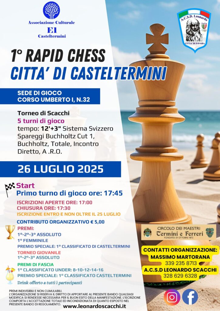 Il prossimo 26 luglio 2025 Casteltermini sarà teatro di un evento unico nel suo genere: il primo torneo di scacchi organizzato dall’associazione E1 con il fondamentale ausilio dell’A. C. S. D. “Leonardo” città di Favara e in collaborazione con il Circolo dei Maestri “Termini e Ferreri”, che avrà luogo con la formula Rapid Chess. Si tratta di un’iniziativa che rappresenta un importante momento di aggregazione e cultura per la nostra cittadina e al tempo stesso un’occasione preziosa per promuovere uno dei giochi più antichi e affascinanti della storia umana.