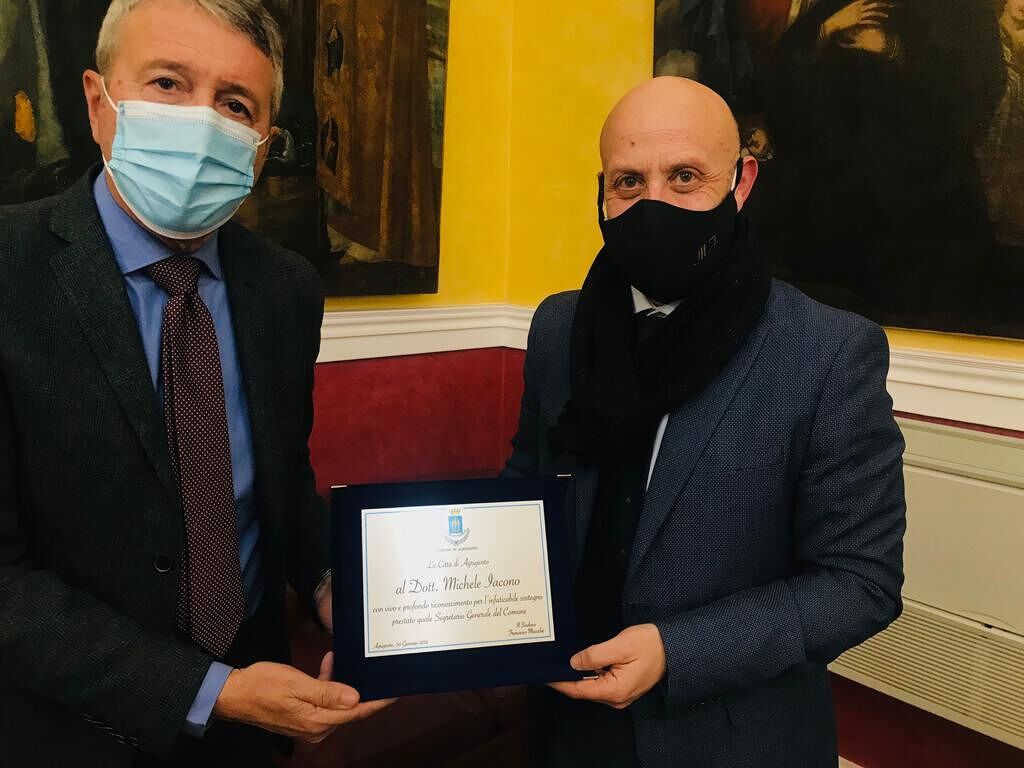 Saluto di commiato al Palazzo di città di Michele Iacono. Dopo quattro anni di attività ,oggi ha concluso l’incarico di segretario generale del Comune di Agrigento. Il sindaco Franco Miccichè lo ha ringraziato per il lavoro svolto e gli ha consegnato una targa ricordo dell’amministrazione comunale agrigentina. Lunedì prossimo s’insedierà la dottoressa Maria Concetta Floresta, 56 anni di Catania, selezionata fra 12 candidature presentate e che lascia l’incarico di segretario generale del Comune di Lentini.