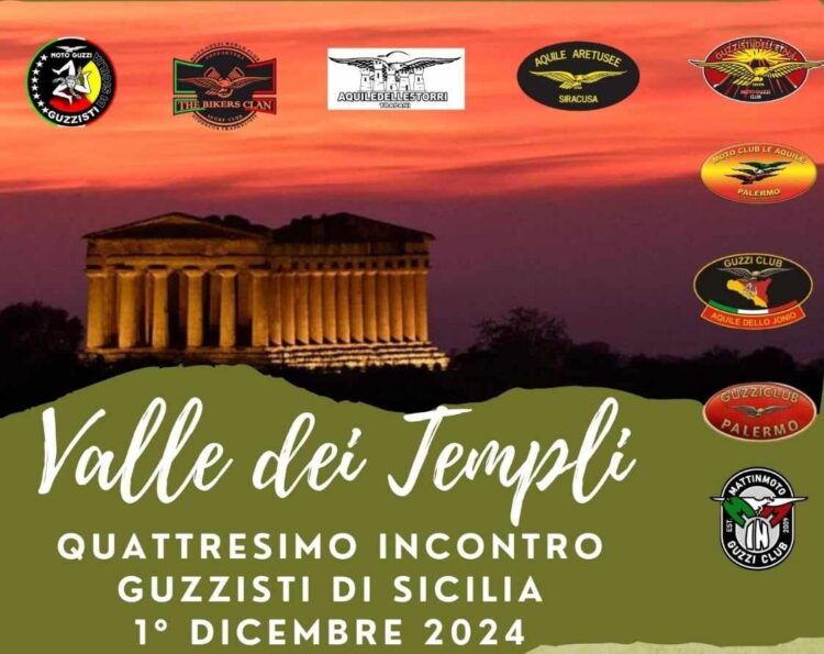 La Valle dei Templi di Agrigento l’1 dicembre prossimo ospiterà il quarto incontro “Guzzisti di Sicilia” che raduna sotto un unico logo tutti i più importanti e rappresentativi club dell’isola, riconosciuti ufficialmente dal Moto Guzzi World Club. “Guzzisti di Sicilia” nasce dal sogno di riunire tutti i club Moto Guzzi sotto un unico logo. Pur mantenendo l’identità locale, si alleano per testimoniare la fratellanza e l’unione fra gli appassionati della due ruote in generale e delle Guzzi in particolare e si adoperano per la promozione e la conoscenza del territorio attraverso i viaggi su due ruote.