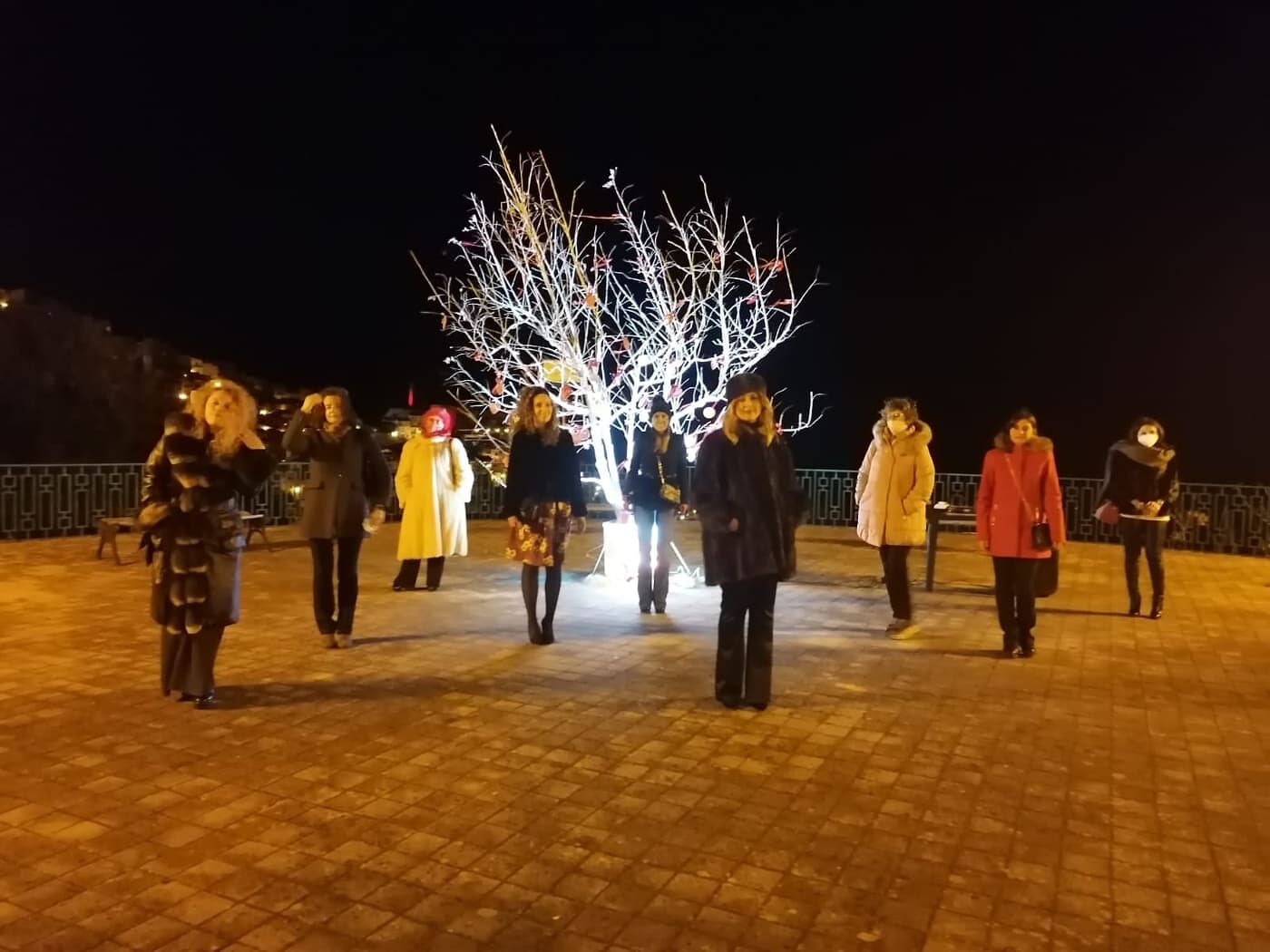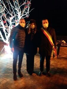 Un albero dai rami spogli, di colore bianco, proteso in avanti empaticamente verso l’altro, come simbolo di cambiamento culturale, perché il Natale è gioia per molti, ma sedie vuote per altri. Per tale ragione si è voluto addobbare l’albero, con i nomi delle vittime, simbolo della vita, e con l’accensione della luce per mano del piccolo Nicolò Cairone, simbolo di speranza.