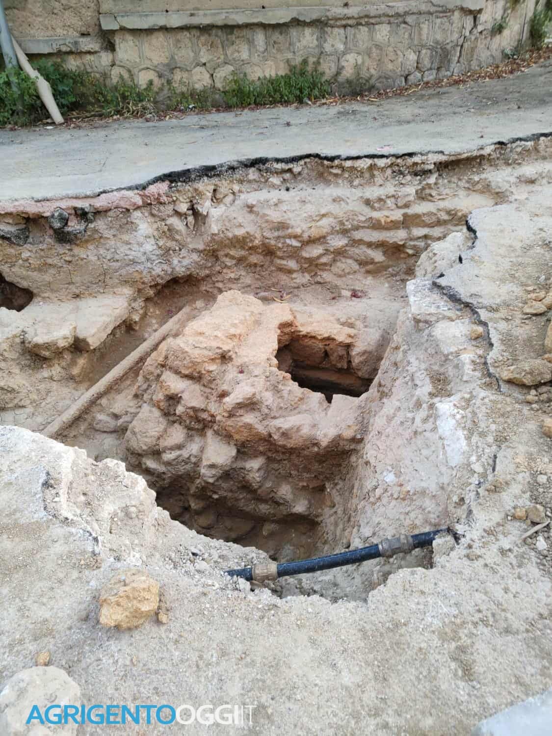 Dallo scavo d’emergenza — aperto sotto il manto d’asfalto di una strada urbana — affiora una cavità ipogea ricavata nella tipica calcarenite agrigentina. L’apertura superiore, oggi parzialmente crollata, tradisce una lavorazione antica: il taglio è regolare, senza uso di malta, e la tessitura pare litica più che muraria. La volta interna è ancora visibile in sezione e appare scavata direttamente nel banco roccioso, soluzione frequente in un territorio dove scavare costava meno che trasportare pietre.