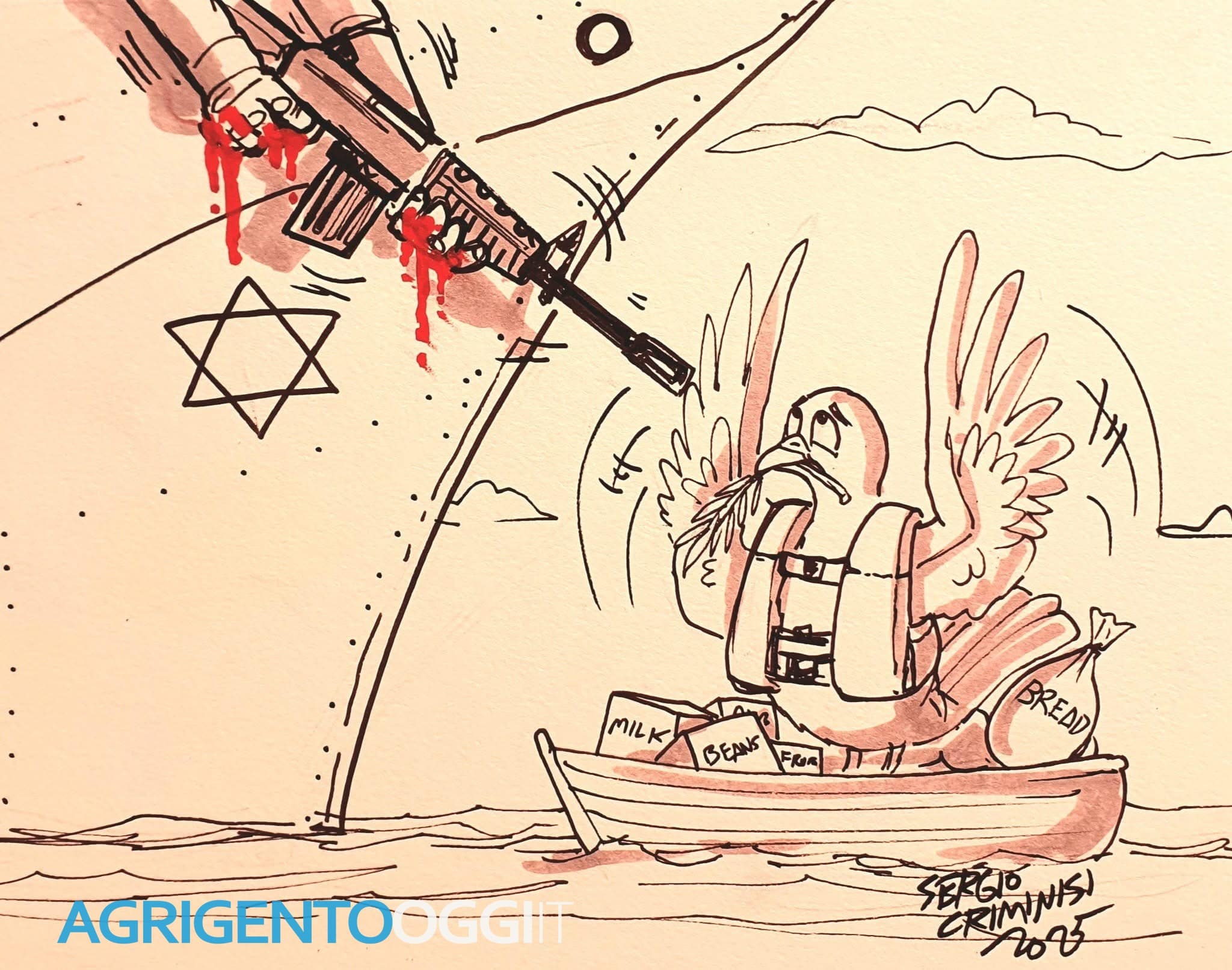La vignetta di Sergio Criminisi, artista da sempre sensibile alle grandi questioni civili e umanitarie, racconta con straordinaria potenza questo momento: una colomba della pace, inerme e disarmata, minacciata da un fucile mentre trasporta aiuti.