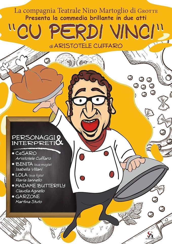 Dopo il successo della prima rappresentazione brillante della commedia degli equivoci “Cu perdi Vinci”, scritta, diretta ed interpretata da Aristotele Cuffaro. Domani sabato 29, la Compagnia Teatrale “Nino Martoglio” torna a riproporla a Castrofilippo per continuare in una tournée estiva in diversi paesi della Sicilia tra i quali Giardina Gallotti, Realmonte, Racalmuto, Raffadali, Casteltermini, Ravanusa, Comitini e Grotte. Gli spettacoli avranno inizio alle ore 21.30. Protagonista dello spettacolo è lo stesso autore, Aristotele Cuffaro, nei panni di Cesaro (il cuoco); con lui sul palco gli attori: Isabella Villani (Benita, sua moglie); Flavia Iannello (Lola, sua figlia); Claudia Agnello (Madame Butterfly, la cantante lirica). Fonico e datore luci: Simona Zaffuto. Scenografia: Walter Maria Lombardo e Antonio Petralito. Questa la trama della commedia: Cesaro emigra dalla Sicilia e va nel Lazio, a Latina, per aprire una trattoria e facilitare il successo della figlia, dotata di una bellissima voce e che vorrebbe fare la cantate. La moglie di Cesaro è una forte donna con il sogno nel cassetto di fare la Podestà, sottomettendo il marito per le sue condizioni fisiche fragili. I coniugi, nel tentativo di tradirsi vicendevolmente, dopo avere letto un articolo su un giornale si ritrovano, mascherati inconsapevoli l’uno dell’altra, nella trattoria. La figlia, dopo tante peripezie e con l’aiuto della vicina di casa cantante lirica, riesce a studiare, perfezionarsi ed essere ingaggiata dal manager della stessa cantante.