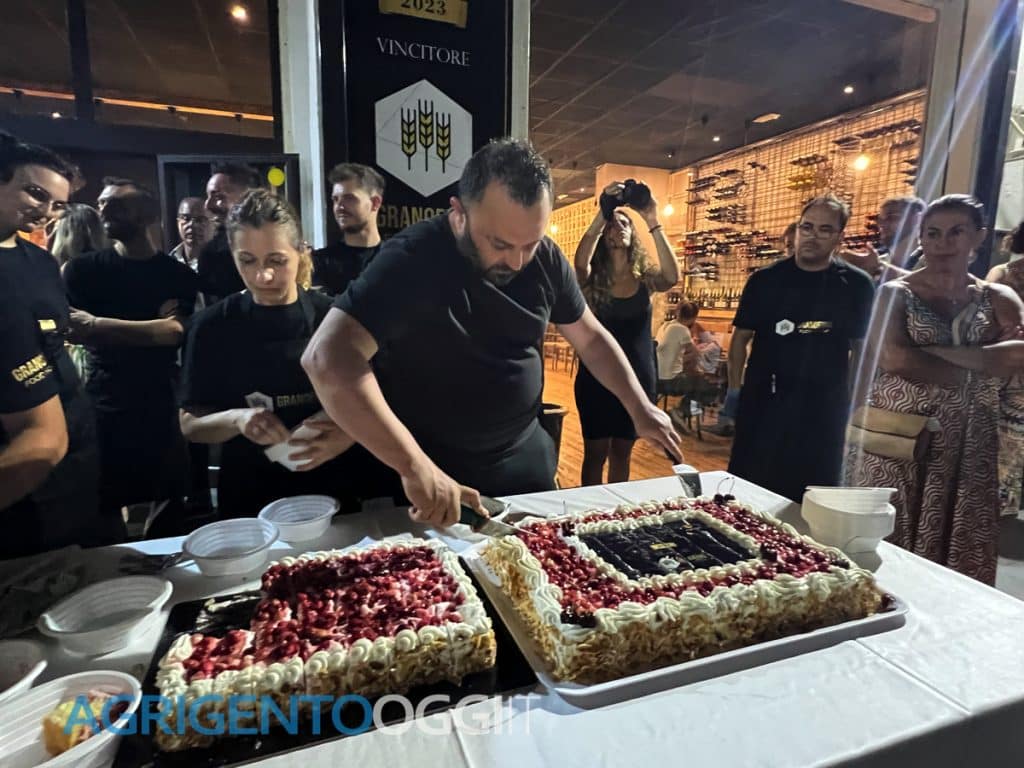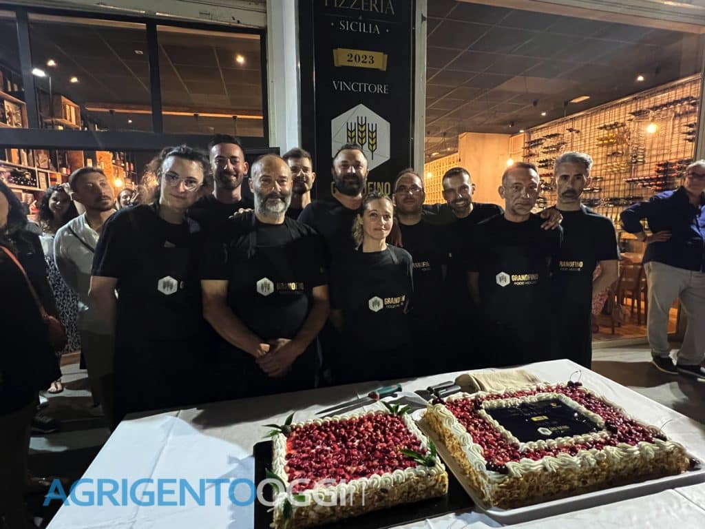 Agrigento – Grande gioia e festa alla pizzeria Granofino che è stata insignita del prestigioso titolo di “Migliore Pizzeria di Sicilia” nel Contest di All Food Sicily. Il patron della pizzeria, Mario Ciulla, ha festeggiato insieme al suo staff con un’emozionante cerimonia durante la quale è stata tagliata una gigantesca torta. Alla celebrazione hanno partecipato diversi giornalisti tra cui Adalberto Catanzaro e Salvo Scaduto, rispettivamente ideatore del Contest e direttore responsabile del sito che ha promosso l’iniziativa.