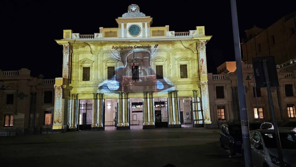 AGRIGENTO – Piazza Guglielmo Marconi, meglio conosciuta come piazza della stazione, è diventata un palcoscenico di luci e storia. Sabato sera, il prospetto della stazione centrale ha preso vita grazie a un video mapping che, in pochi minuti, ha raccontato i 2.600 anni di storia della città. Dall’antica Akragas ai giorni nostri, un viaggio che intreccia tradizioni, epoche e figure emblematiche come Empedocle, Pirandello e Camilleri.