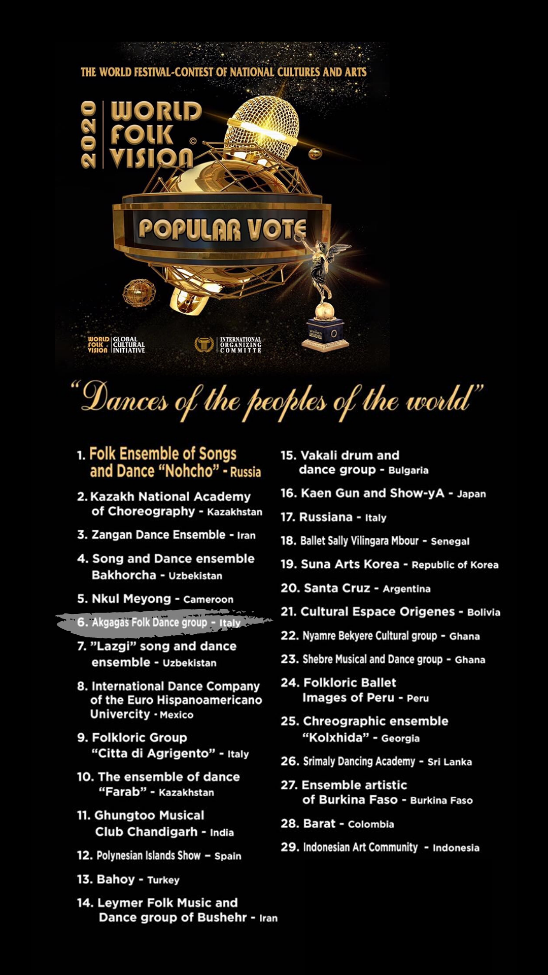 Grazie a una votazione popolare e al verdetto di una giuria di esperti, ci siamo classificati come il primo gruppo folklorico agrigentino e italiano oltre che 6° in assoluto nella sezione danza, tra i 3950 partecipanti al World Folk Vision.