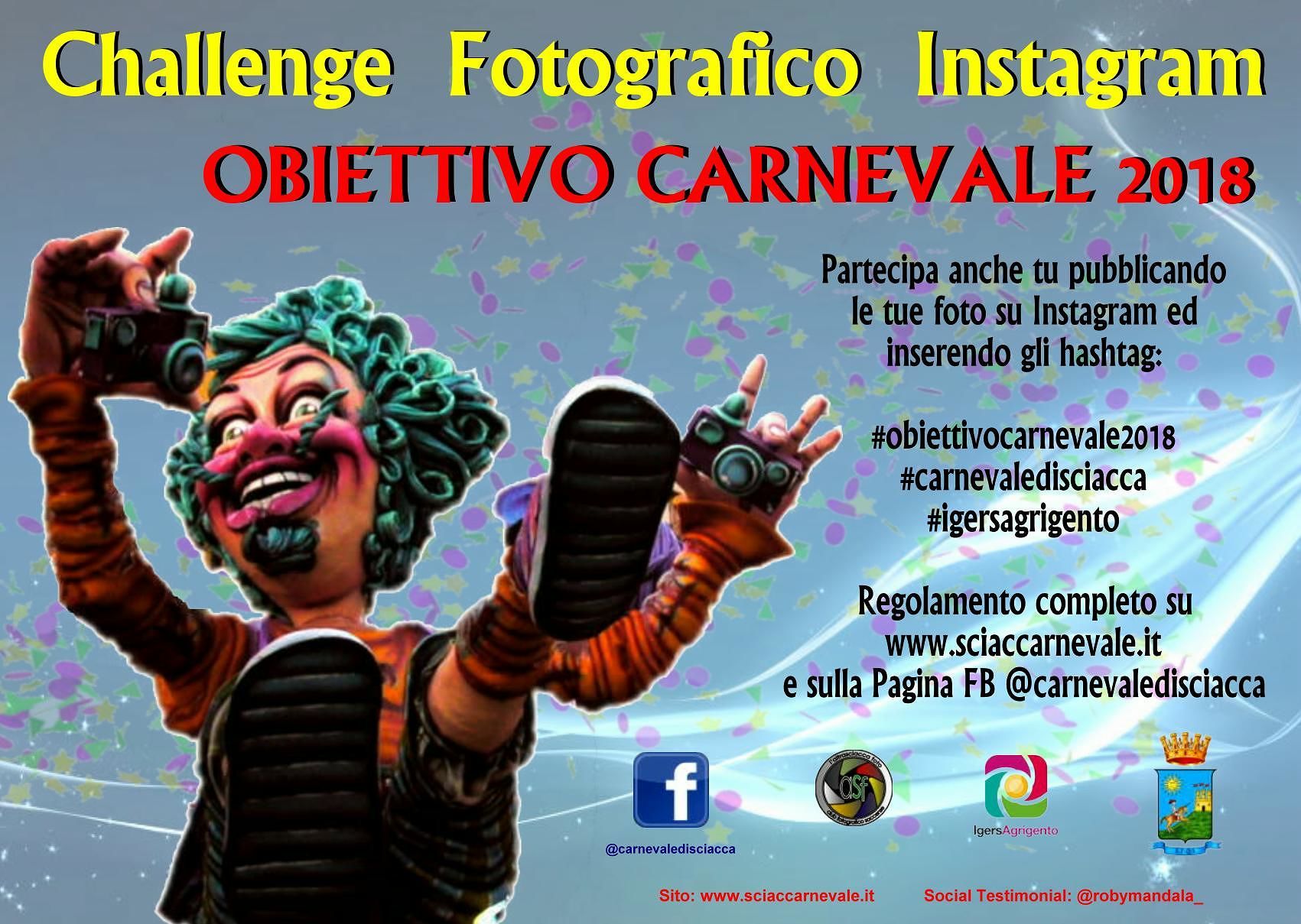 Il challenge ha lo scopo di promuovere la manifestazione attraverso la fotografia e chiama i partecipanti ad eseguire degli scatti durante l’evento, che ritraggano le fasi di costruzione, montaggio e sfilata dei carri, ma anche le maschere, i gruppi ed i costumi, nonché gli aspetti enogastronomici e tutti quelli che raccontano al meglio il Carnevale Saccense. Le foto dovranno riguardare esclusivamente l’edizione 2018.Per partecipare sarà necessario pubblicare sul proprio profilo pubblico Instagram dal 5 al 12 Febbraio 2018, foto con gli hashtag #obiettivocarnevale2018 , #carnevaledisciacca e #igersagrigento a cui deve essere aggiunta una didascalia che illustri il soggetto della foto e contenga il proprio nome e cognome.