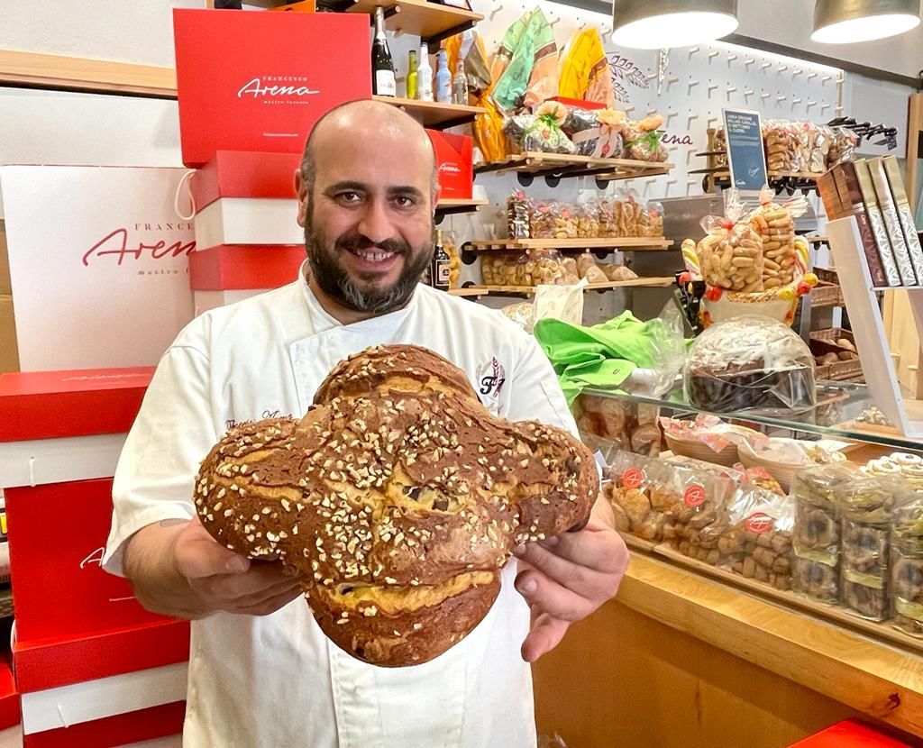 C’è tanta tradizione, grande cura e ricerca nei prodotti sfornati dall’Ambasciatore del Gusto Francesco Arena che per la Pasqua 2022 non farà mancare le sue golose preparazioni che svelano sapori e profumi della nostra terra e ripercorrono la storia e le tradizioni della nostra cultura gastronomica. Il mastro fornaio messinese, che può vantare con orgoglio una storia lunga tre generazioni, in questi giorni, è impegnato a sfornare senza sosta i panini di cena, i cudduri cu ll’ova e le colombe artigianali in molteplici gusti. I panini di cena, simbolo della pasqua messinese, sono dei panini dolci e leggeri, morbidi e profumati, aromatizzati con chiodi di garofano, cannella e vaniglia e ricoperti di ciciulena(semi di sesamo). L’origine è legata alla storica processione delle Varette, in cui i pani venivano posti nella Varetta dell’Ultima Cena, prima di essere distribuiti ai portatori ed è rimasta l’usanza di consumarli alla fine della Processione. Questi panini, pertradizione, il Giovedì Santo, venivano portati in dono alle suocere, così come i cudduri cu ll’ova, ciambelle di pan dolce con le uova sode, il cui nome deriva dalla collura, la forma della corona. I cudduri era il regalo di Pasqua del fidanzato alla fidanzata e si tramanda che, più uova vi erano incastonate, più il promesso sposo era benestante e entrava così nelle grazie della famiglia, in particolare della suocera. La fidanzata poi ricambiava il dono con l’agnello di pasta martorana. Con l’annuncio della Resurrezione del Cristo i cudduri venivano lanciati in aria e si raccoglievano i pezzi per donarli in segno di pace.