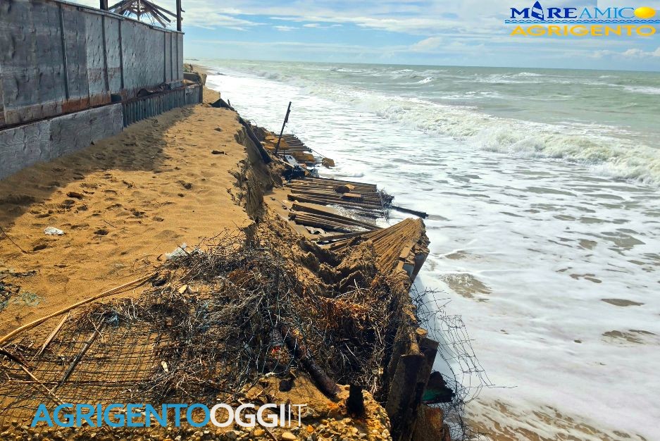 Nella località balneare di San Leone il mare continua ad avanzare. Preoccupa l’erosione costiera. Questa notte ha distrutto la recinzione dell’ex lido dell’esercito, facendo cadere in mare la barriera di difesa del lido, i ferri ed una lunga fila di mattoni di tufo.