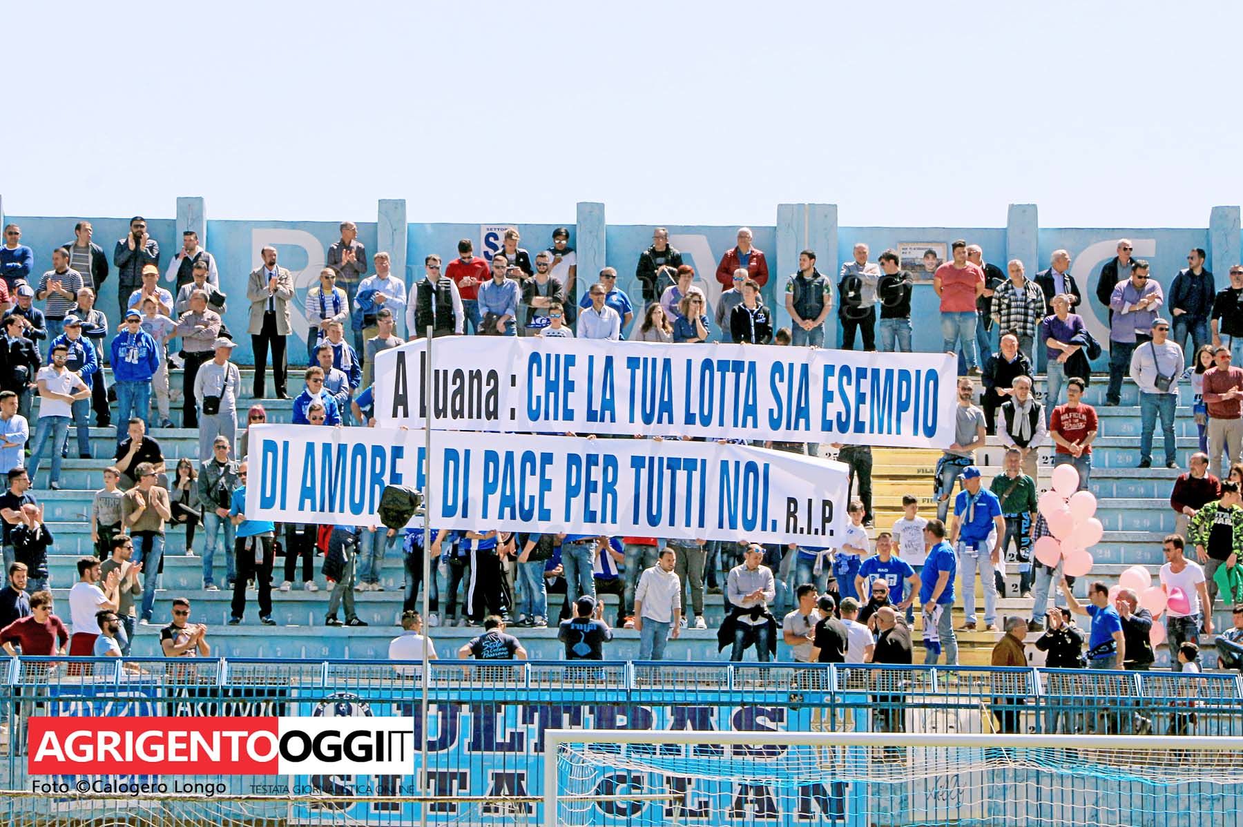 Minuto di raccoglimento allo stadio Esseneto prima di Akragas – Casertana. Tifosi in piedi ad applaudire per rendere omaggio a Luana Indelicato, prematuramente scomparsa ed esempio di coraggio, voglia di vivere e forza interiore. In passato, il papà e il fratello di Luana hanno vestito la maglia dell’Akragas .