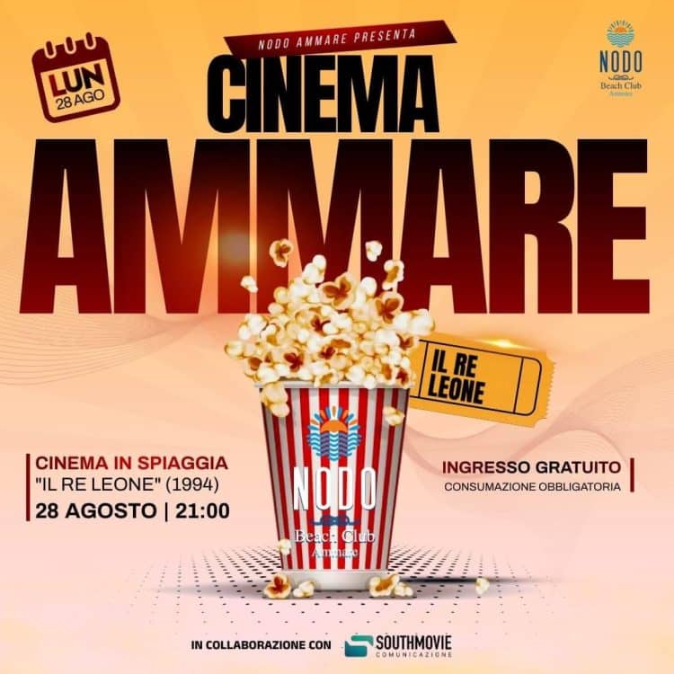 In un periodo dove i cinema d’estate sono sempre di meno torna una delle tradizioni più belle per gli amanti della settima arte, arriva il cinema in spiaggia, rinominato per l’occasione Cinema Ammare dai proprietari del locale Nodo Ammare presso Lido Rossello. Grazie alla collaborazione con il regista agrigentino Marco Gallo e la sua agenzia Southmovie lunedì 28 agosto alle ore 21:00 verrà proiettato il cartone animato “IL RE LEONE”, la prima versione del 1994, un cartone animato che ha sempre colpito grandi e piccoli. Una serata speciale che ci accompagna verso il finale di stagione di questa estate ricca di eventi e lo fa con una novità che manca da tanto tempo in provincia di Agrigento. Sdraio, pop corn, il rumore del mare ed un classico Disney che richiama l’attenzione delle famiglie per una serata all’insegna dello svago. L’ingresso è gratuito ma con una consumazione obbligatoria, al bar o direttamente sulle sdraio. Al momento non sono previste altre proiezioni ma la richiesta è già stata tantissima in poche e chissà che non ci siano altre proiezioni. Appuntamento con il Cinema Ammare lunedì 28 Agosto alle ore 21.