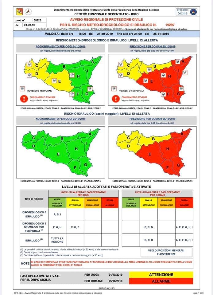 Allerta rossa domani, venerdì 25 ottobre, per rischio idrogeologico, su gran parte della Sicilia. Lo segnala la Protezione civile che ha diramato un nuovo avviso di avverse condizioni meteo.